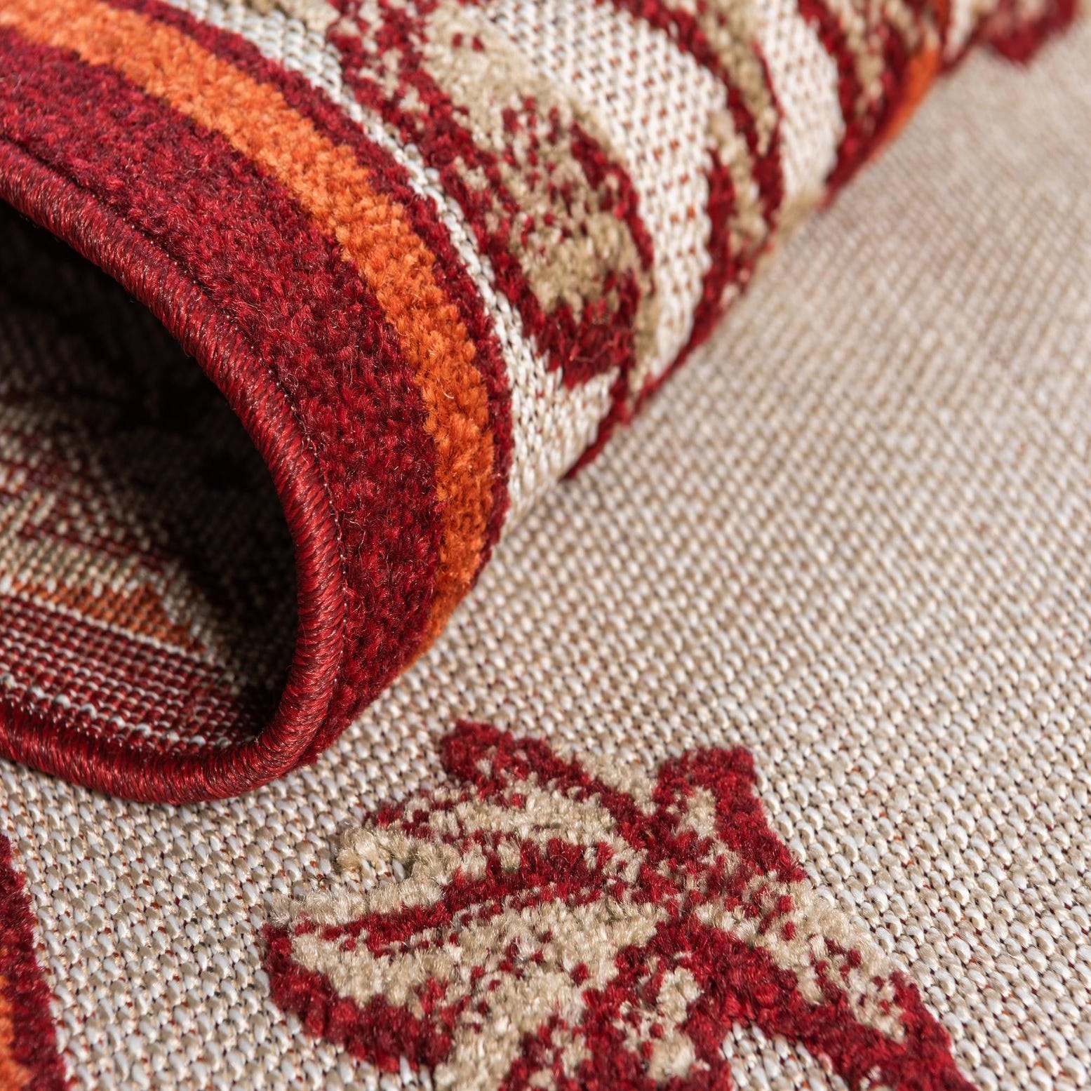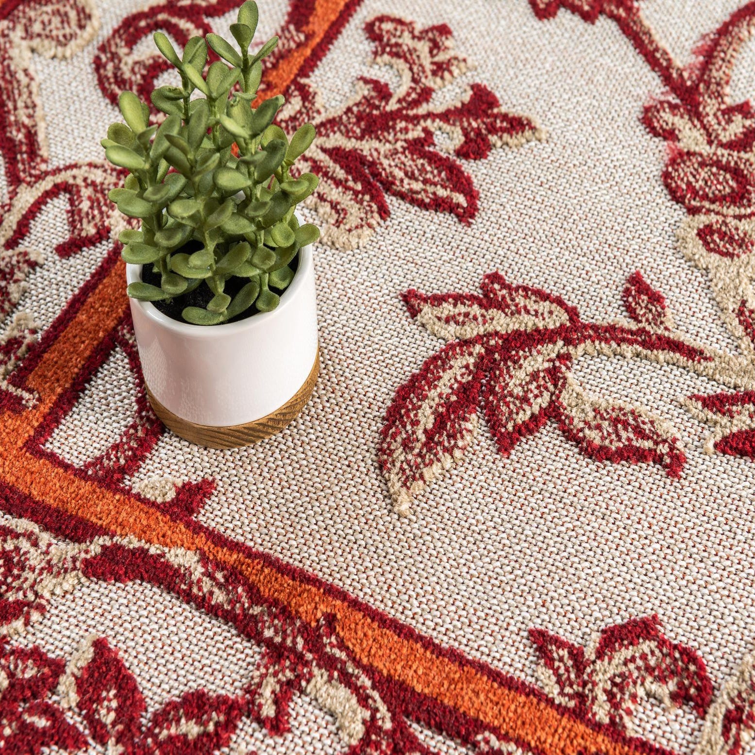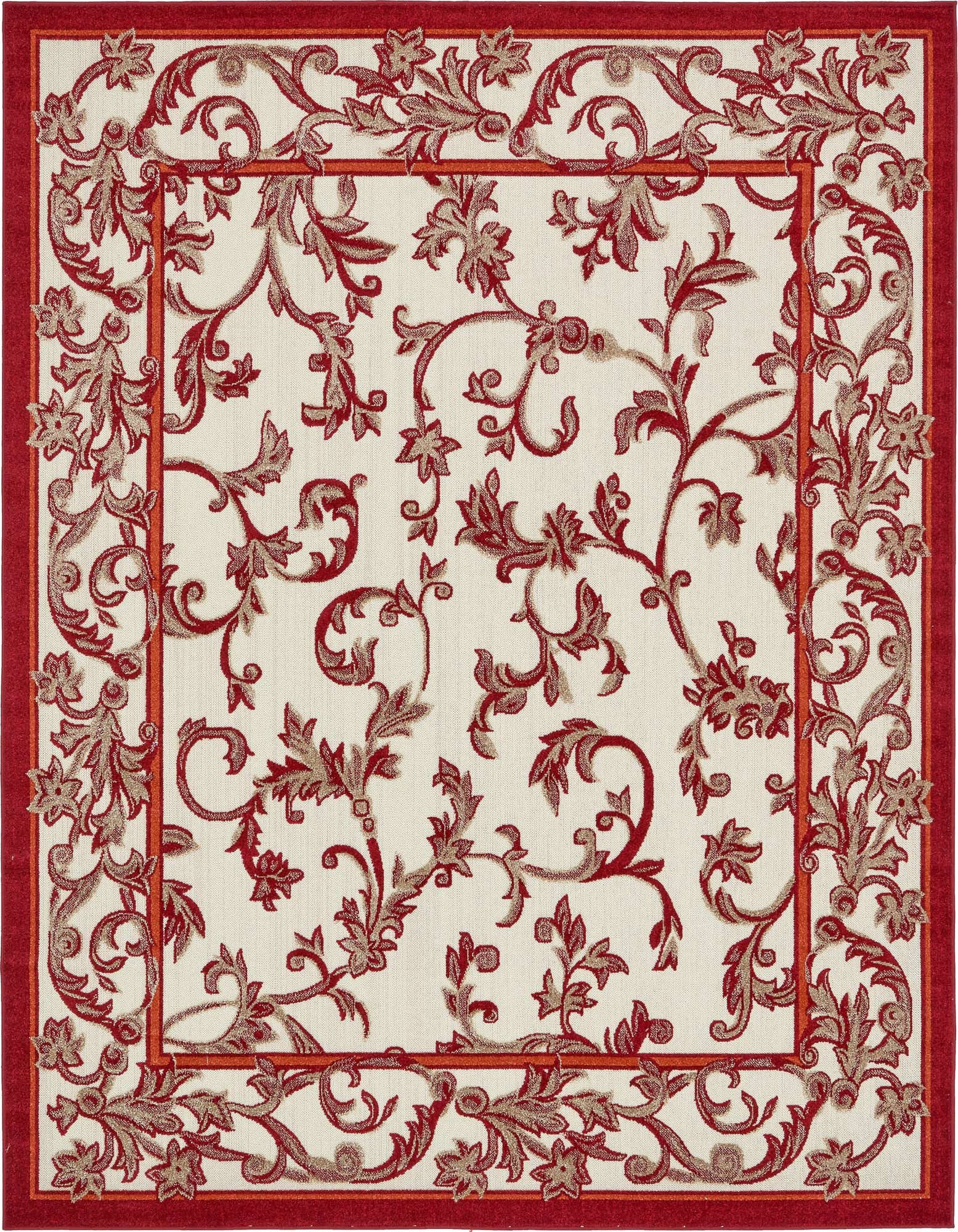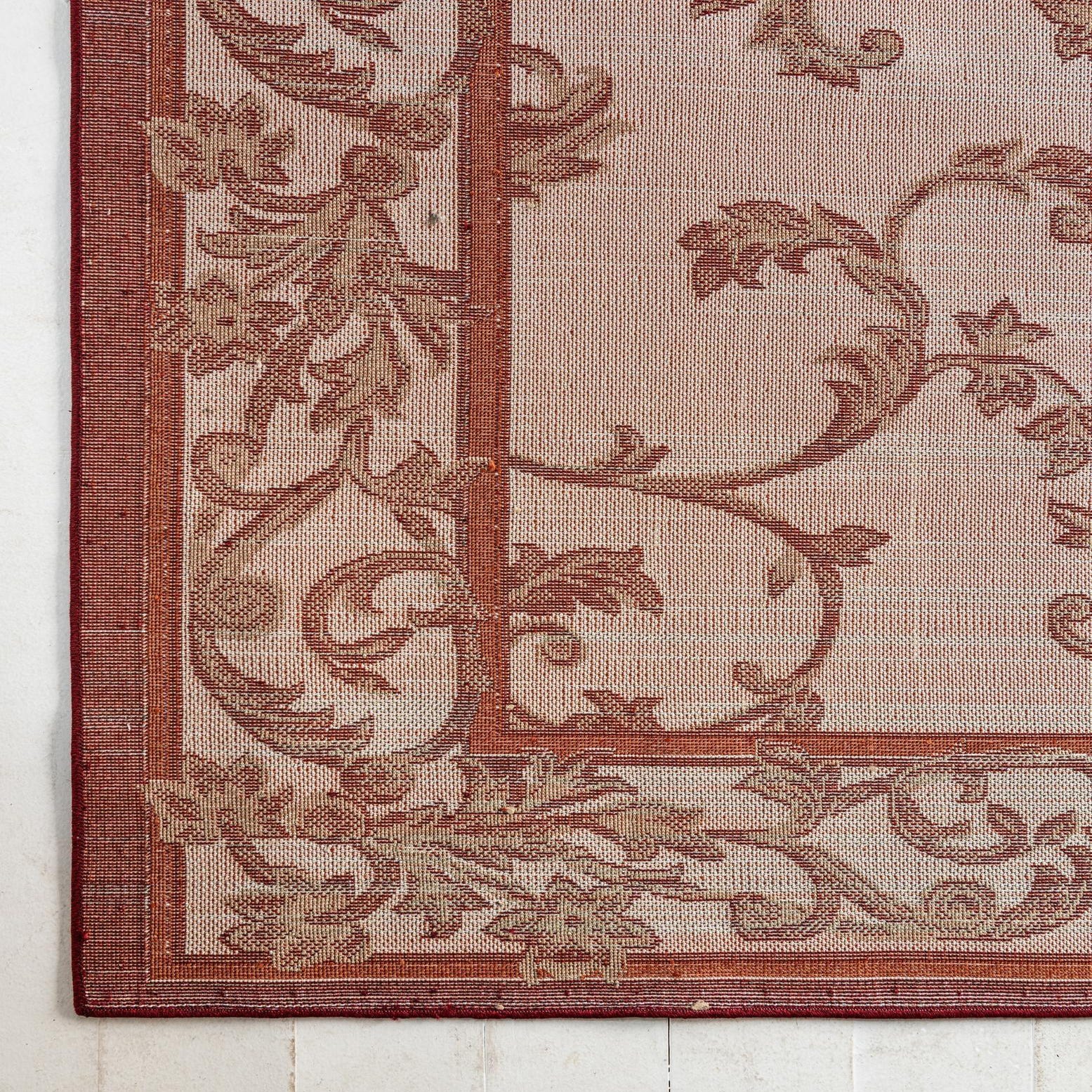 Rich burgundy provides the backdrop for an ornate botanical scroll pattern rendered in shades of red, orange and light brown. Curving vines and stylized leaves form a central field framed by a double border that echoes the same floral motifs, giving the design a classic, garden-inspired look with a contemporary color palette. Machine made of 100% polypropylene, the rug has a low-pile surface with slight textural variation where the pattern is voiced, so the motifs are pleasant to the touch while staying easy to place in active spaces.