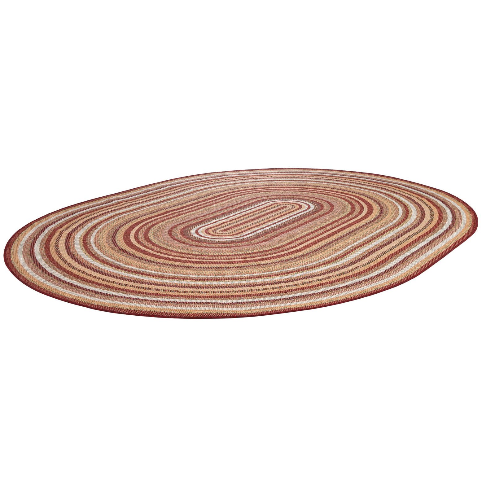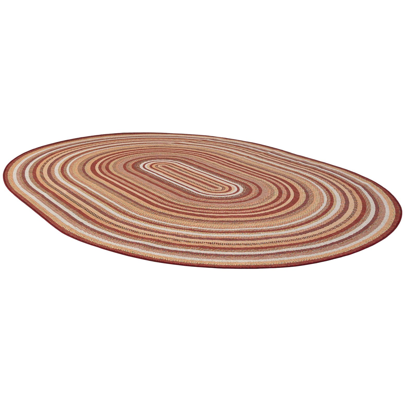 A 7' 10 x 10' 0 oval Baja Outdoor rug featuring concentric red, orange, and beige braided stripes, suitable for a patio.