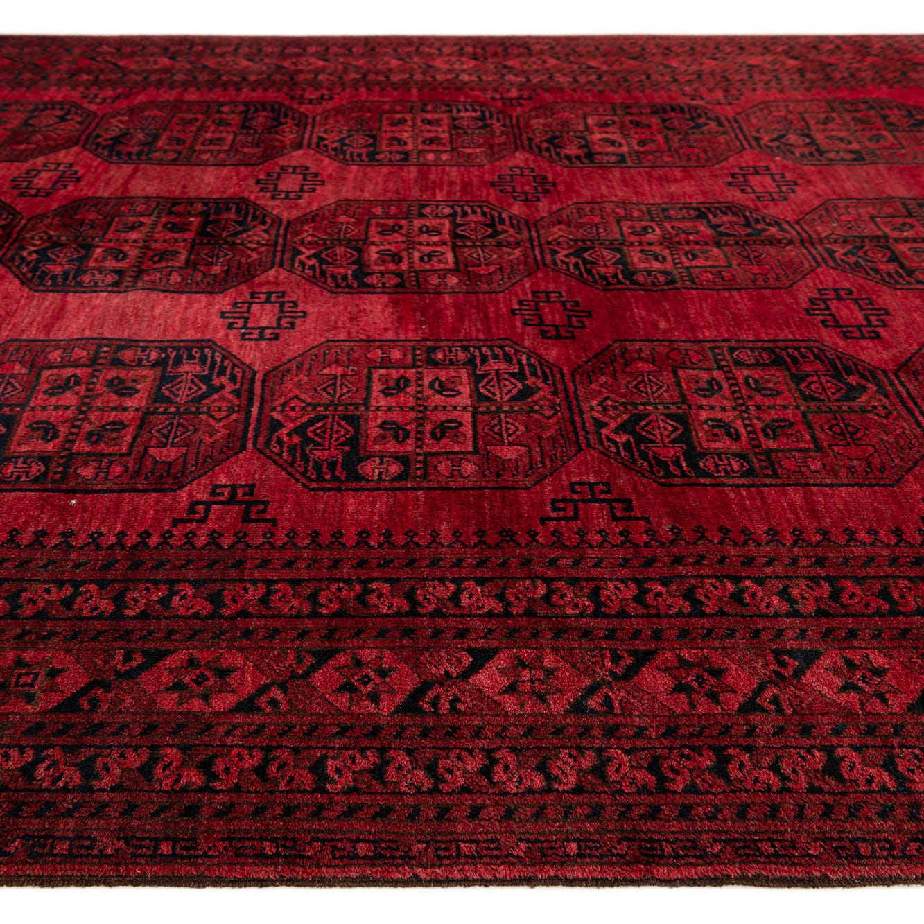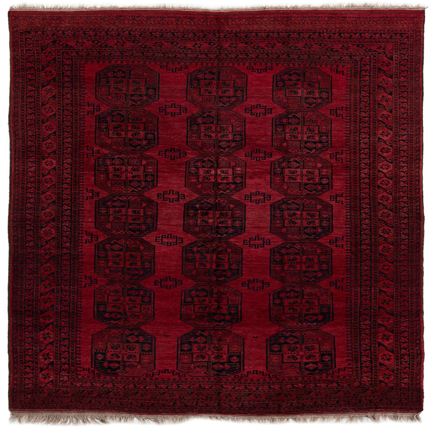 A rectangular 8x11 red tribal Afghan Akhche rug with a repeating pattern of dark geometric medallions and intricate borders.