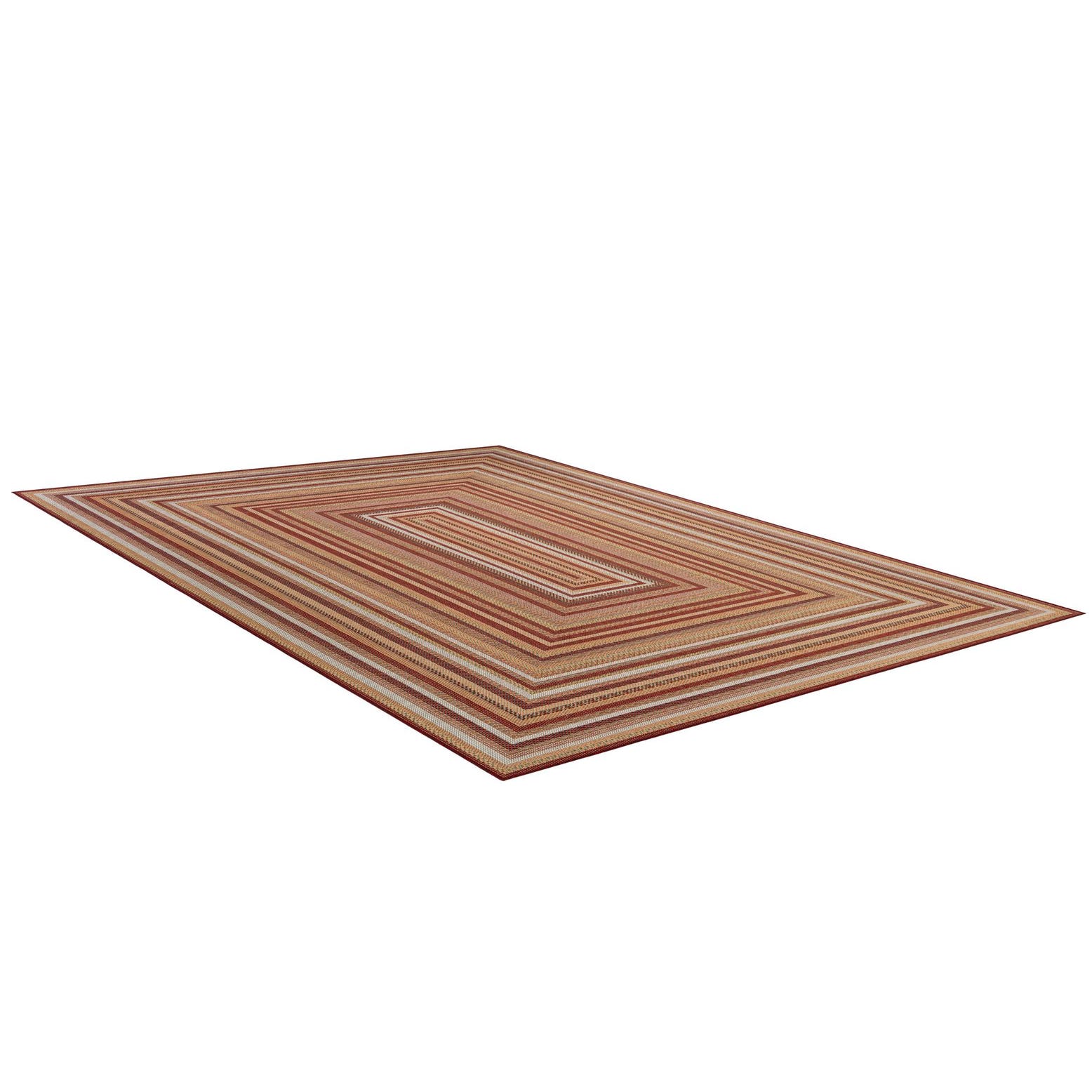 A rectangular 8x11 Baja Outdoor rug featuring a modern stripe pattern in various shades of red, orange, and beige, suitable for indoor or outdoor use.