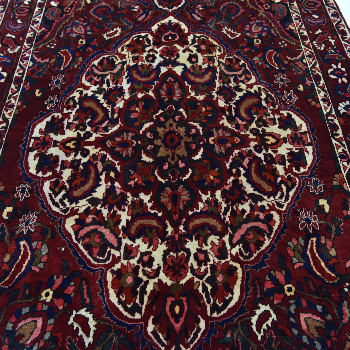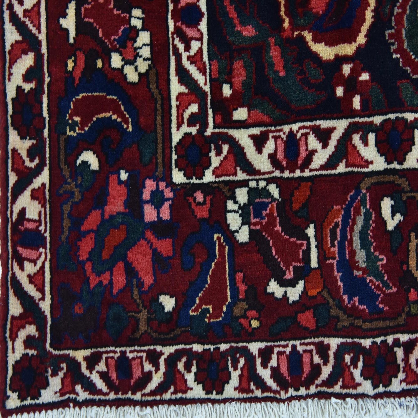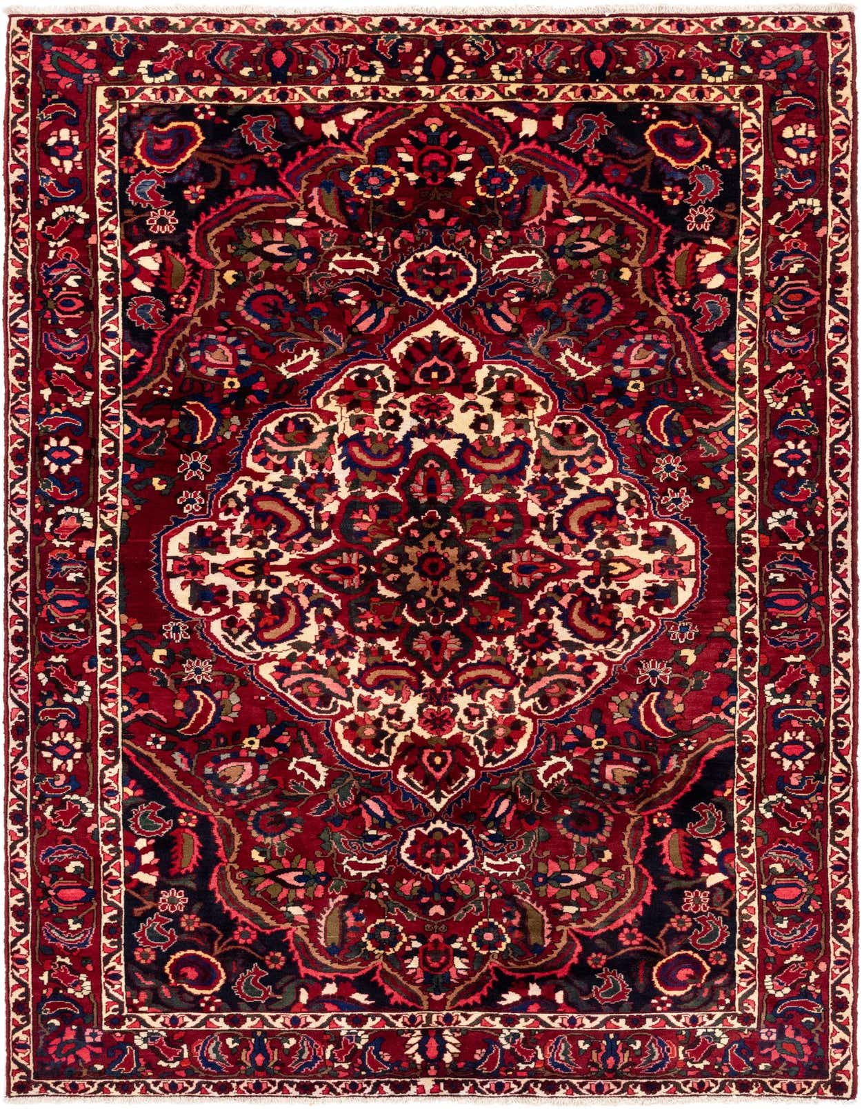 Primary color is Burgundy. Colors in this rug include: Burgundy, Red, Ivory, Navy Blue, Peach, Green, Blue.