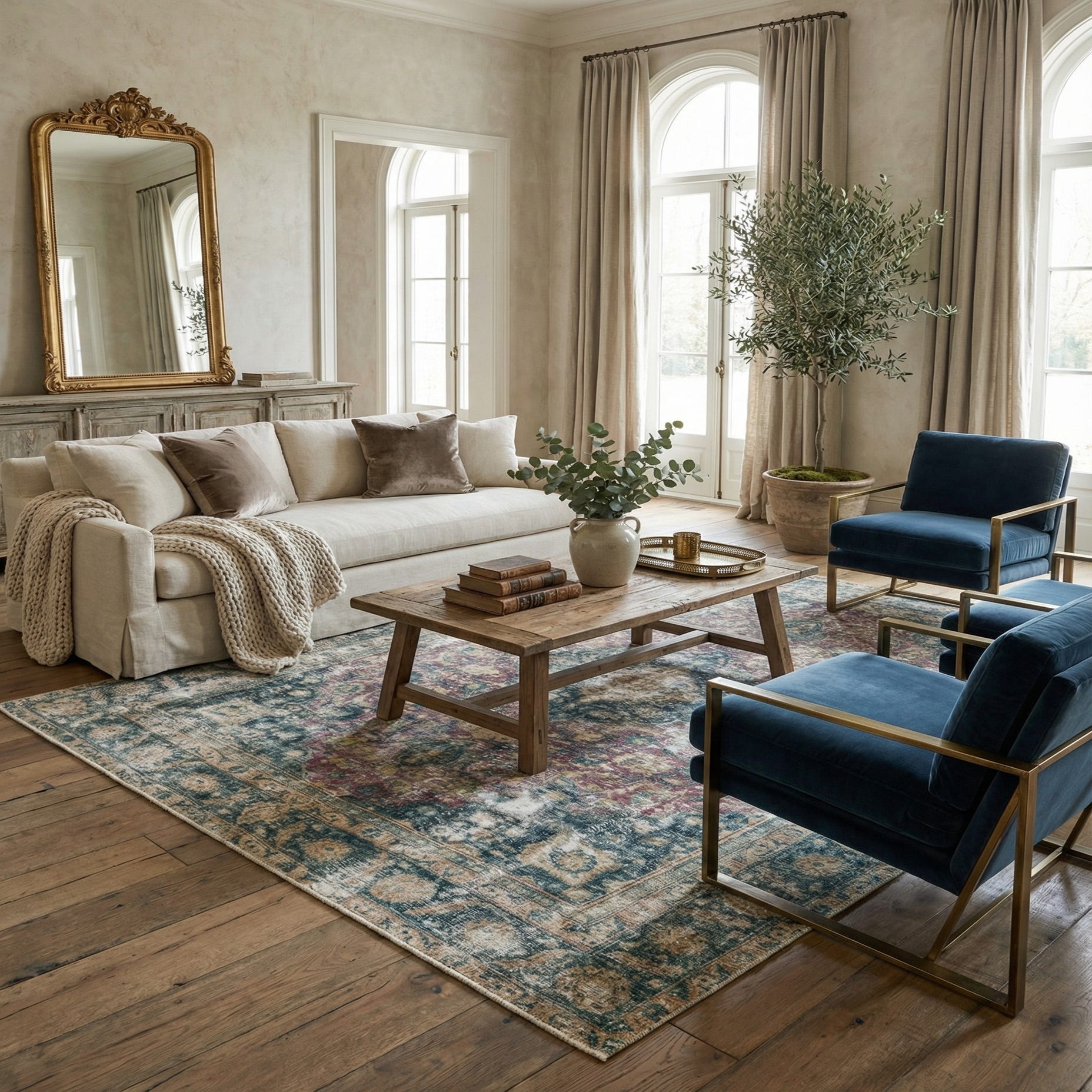 An 8x11 rectangular Ultra Vintage wool rug featuring a distressed Persian medallion pattern in shades of red, teal, and beige.