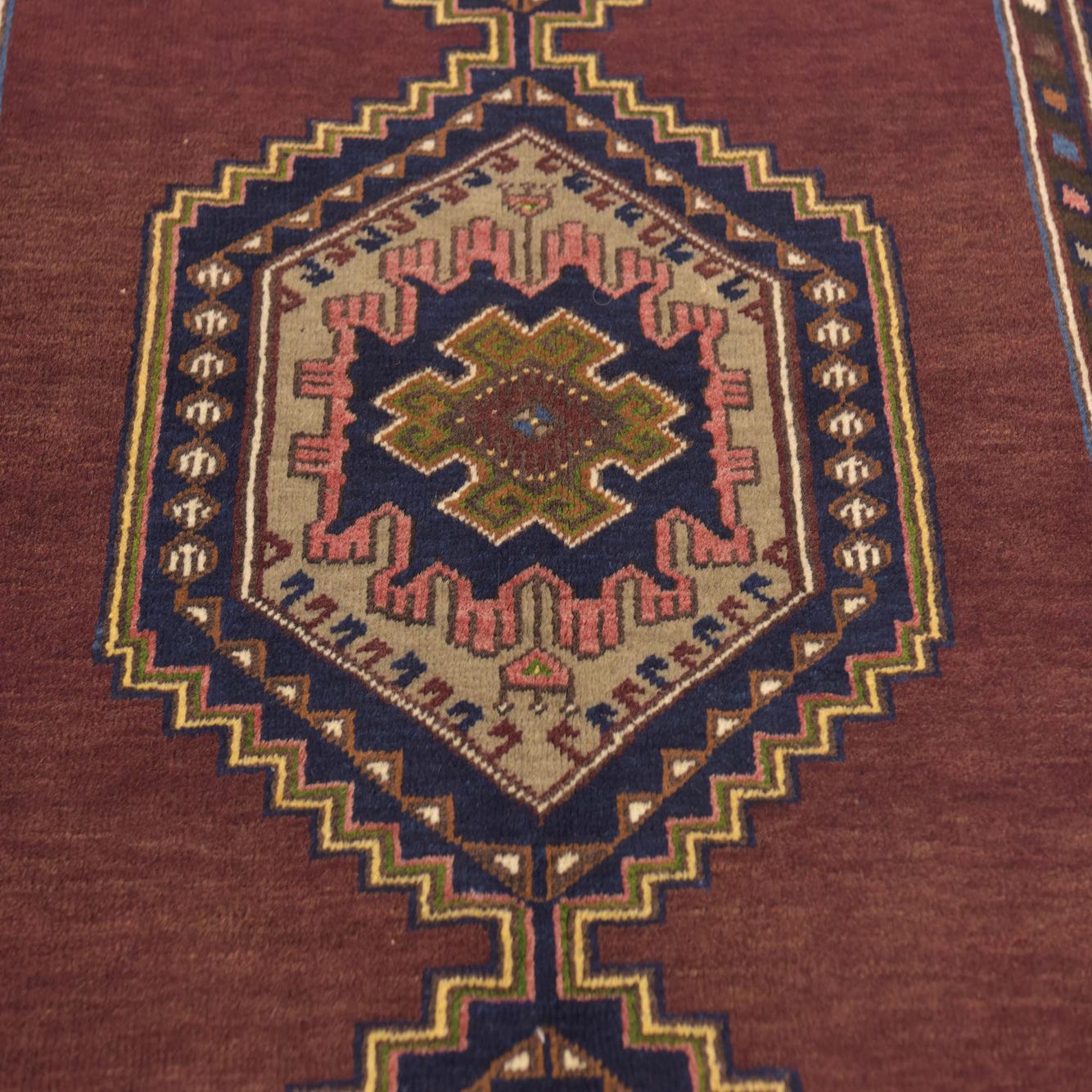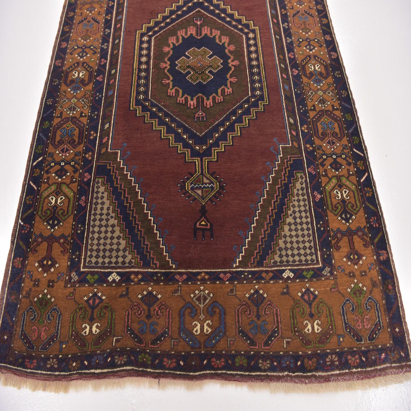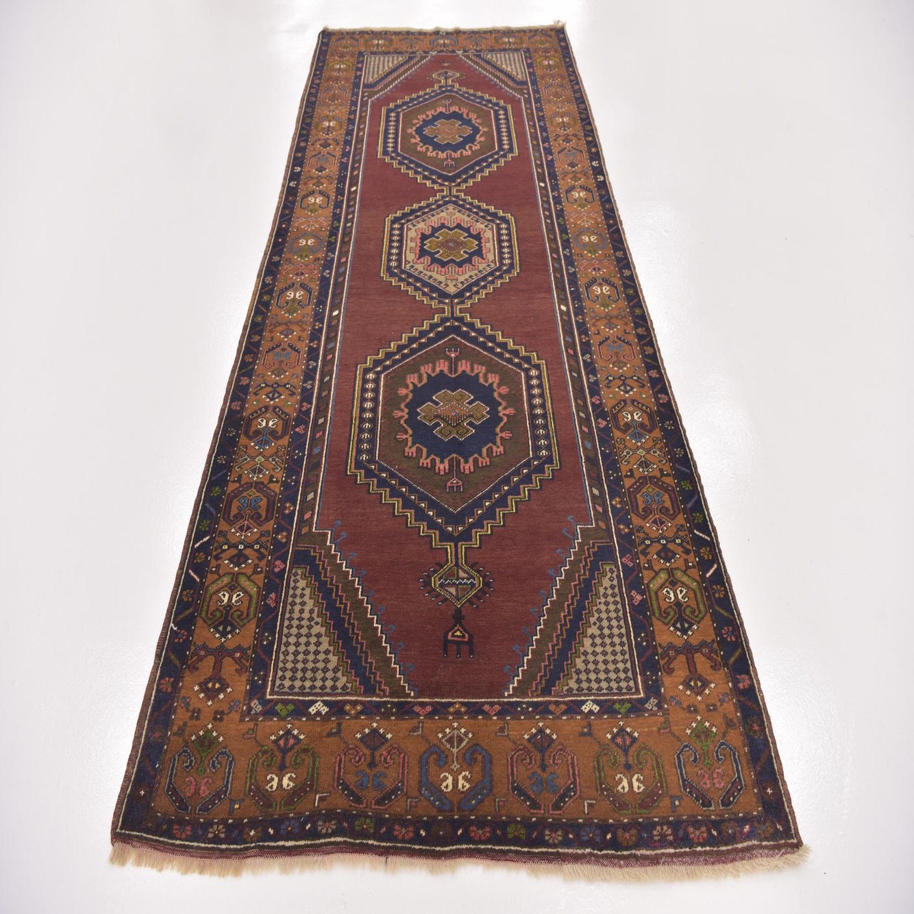 A 9 ft Anatolian runner rug with a deep red field, tribal medallions, and a detailed brown and navy border.