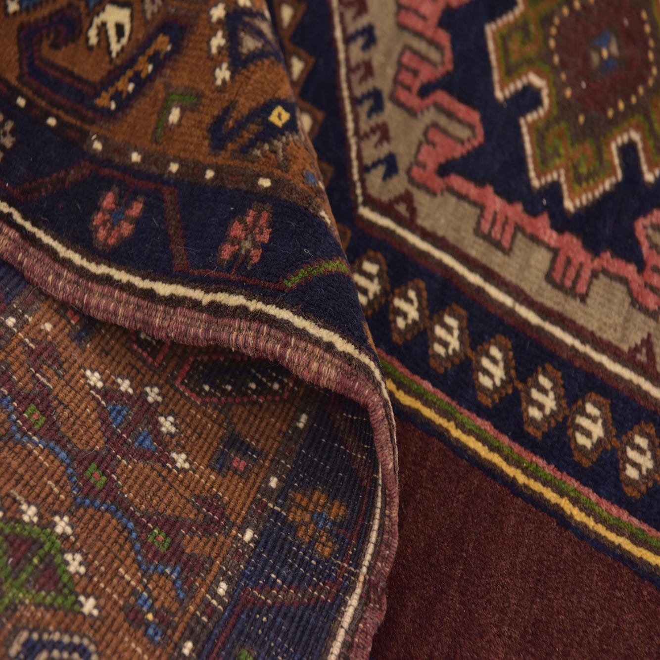 Primary color is Burgundy. Colors in this rug include: Burgundy, Beige, Black, Blue, Brown, Green, Ivory, Navy Blue, Orange, Red, Pink.