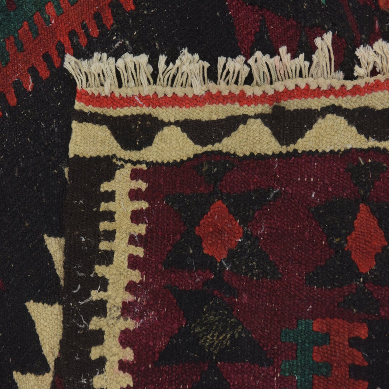A 9 ft Kilim Fars runner rug with a black center, red and green geometric patterns, and cream accents.