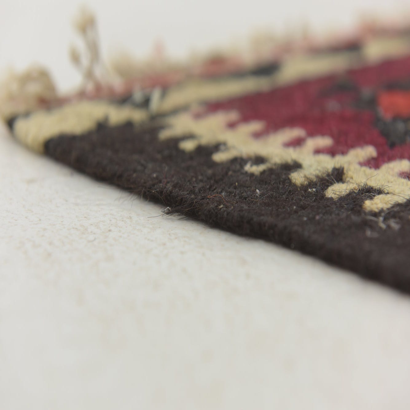 Primary color is Burgundy. Colors in this rug include: Burgundy, Black, Green, Ivory.