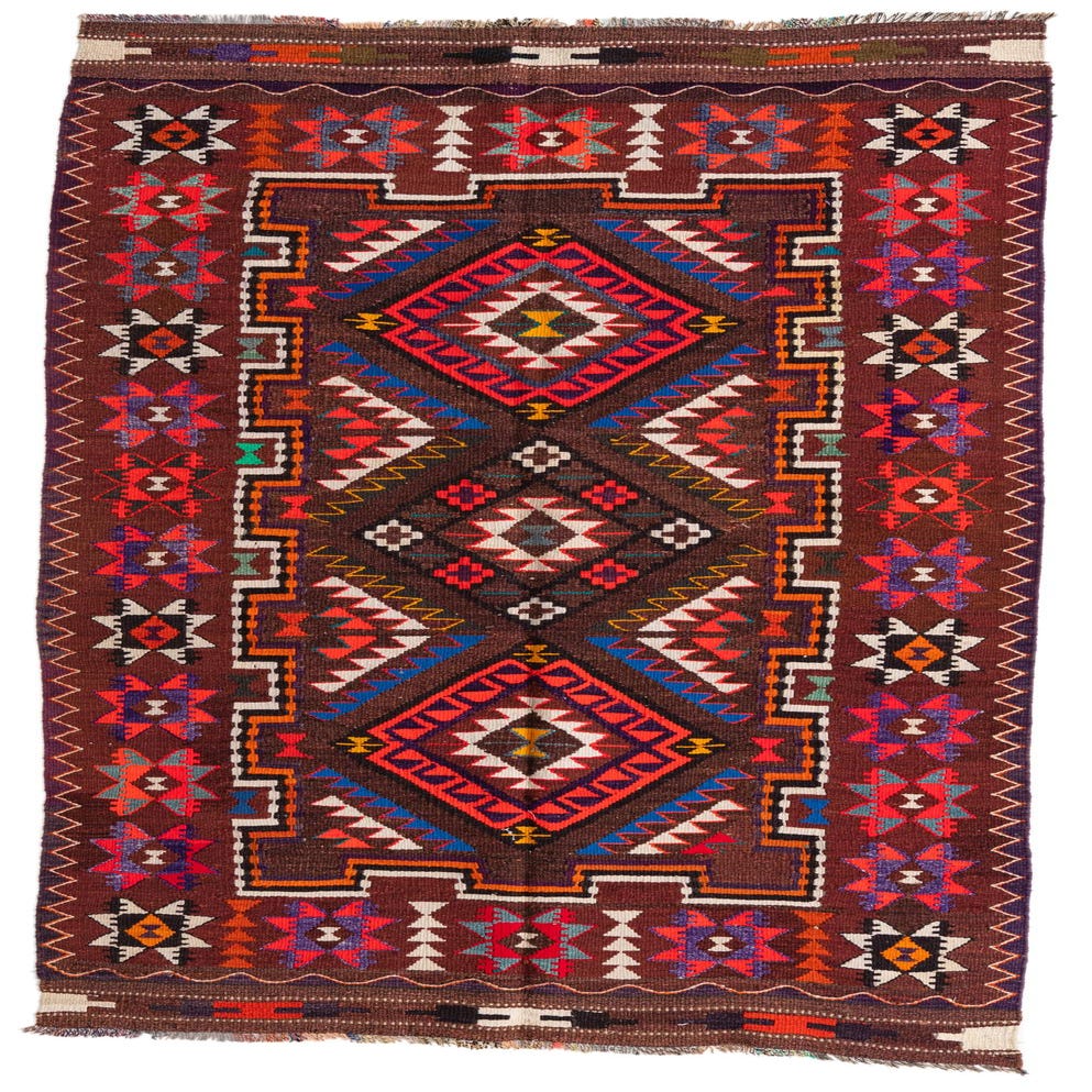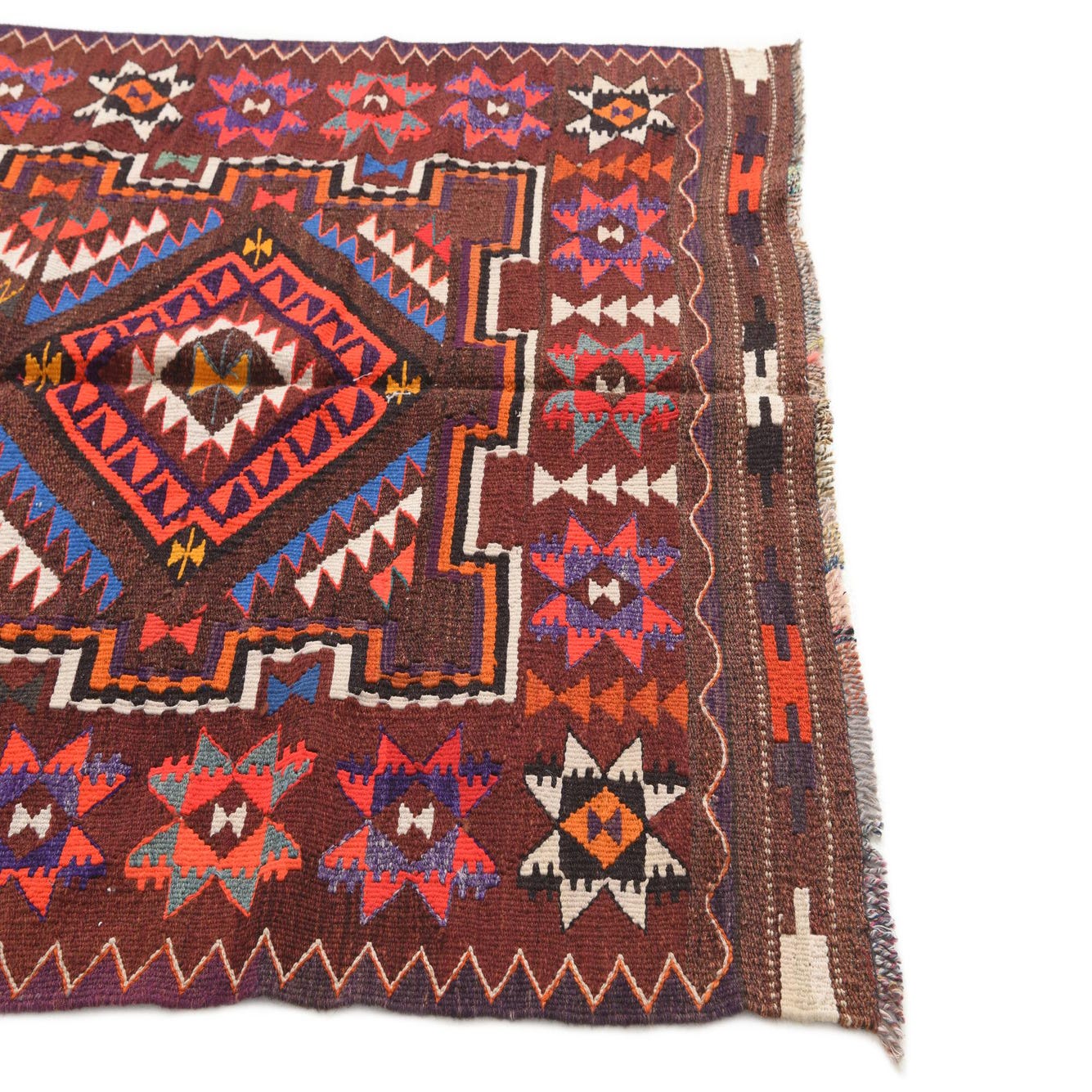 A 9 ft runner rug from the Kilim Fars collection, featuring a vibrant tribal pattern in reds, blues, and oranges on a dark brown background, suitable for a hallway.