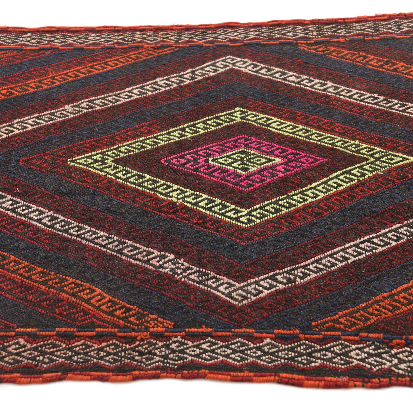 A 9 ft runner rug from the Kilim Fars collection, featuring a vibrant red tribal geometric pattern with colorful diamond accents and lime green fringes.