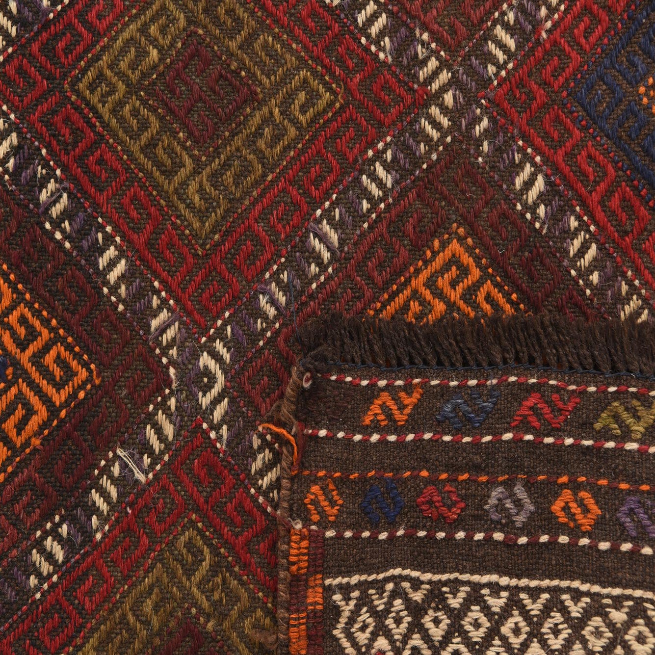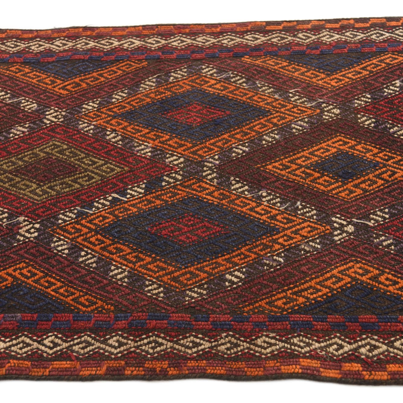 With its semi-antique status (40-60 years old), it carries the patina of time, making it suitable for those who appreciate the historical character in their decor. The flatweave texture of the wool further enhances the rug's authentic appeal.