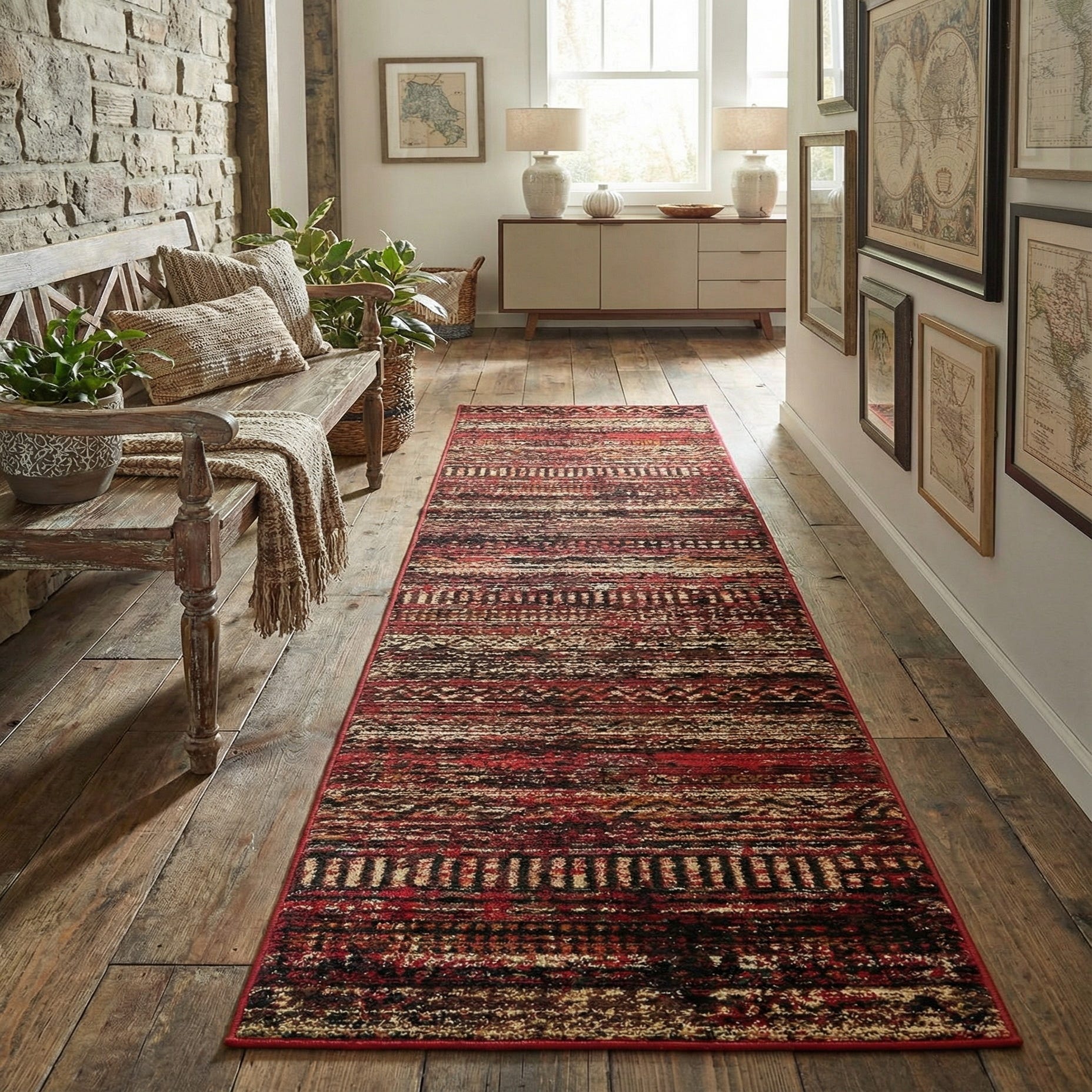 Machine-made of polypropylene, the rug has a low, even pile with a soft hand and a subtle sheen that catches light across the textured surface. Ideal for a hallway or entry, it also works well along a kitchen aisle or at the foot of a bed. Pair it with warm wood floors and leather seating for a grounded, lived-in feel, layer it under neutral sofas to add color and pattern, or use it to complement eclectic, bohemian, transitional, or rustic-modern interiors.