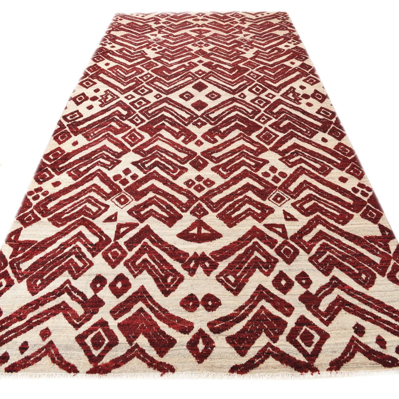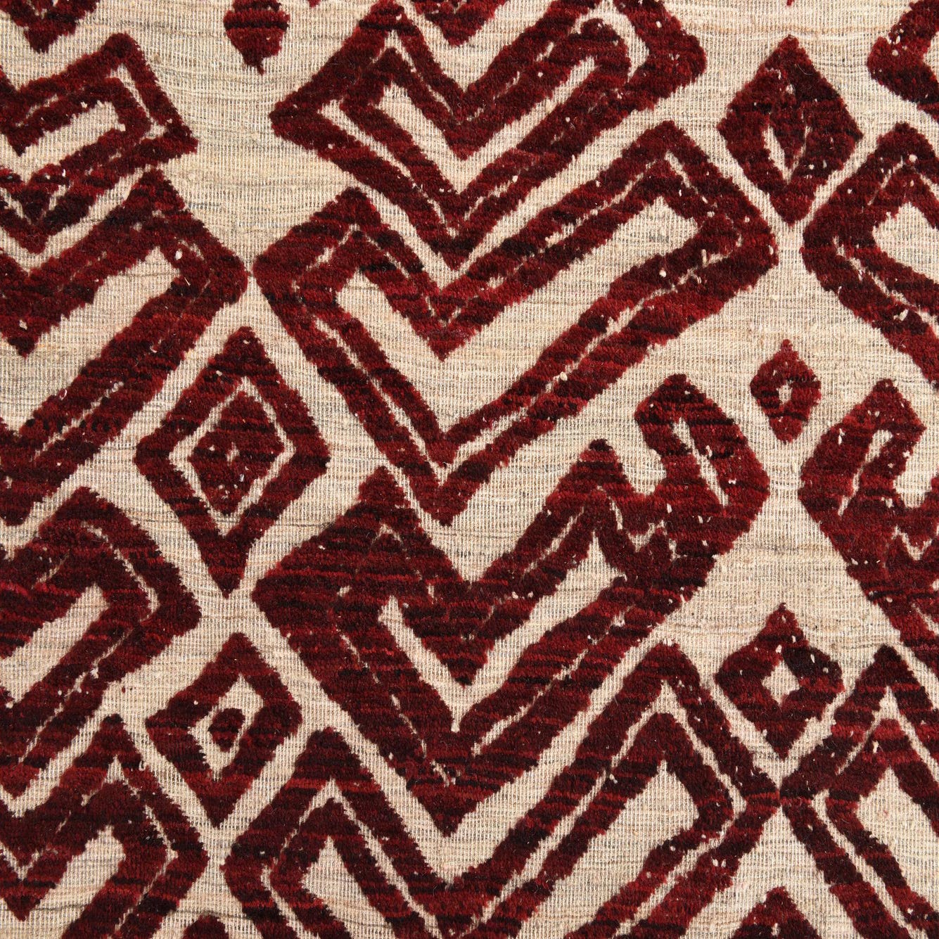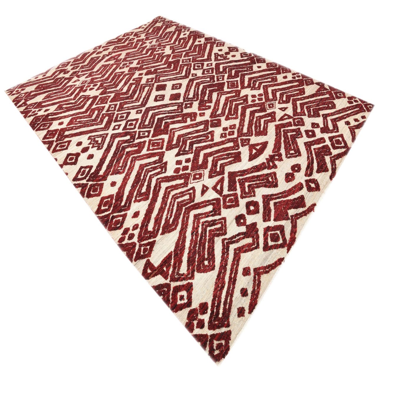 A 9x12 rectangular Darya rug with a modern abstract pattern in deep red on a natural wool background.