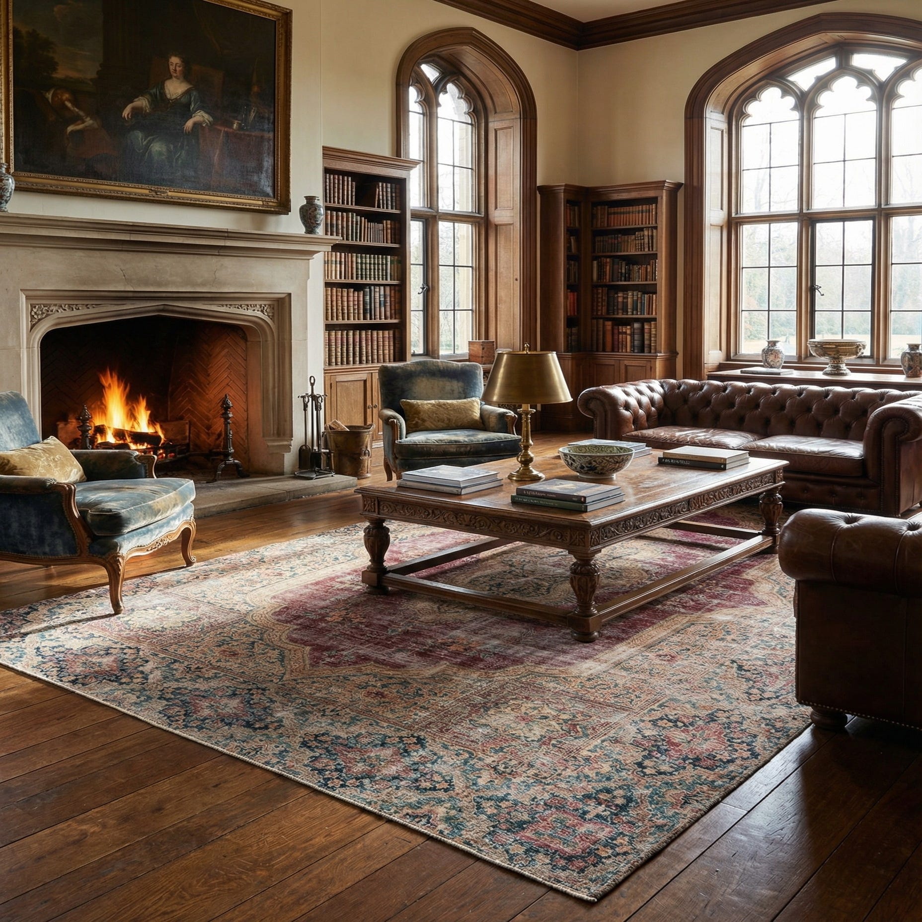 Place this rug to anchor a living room seating group or beneath a dining table to bring warmth and pattern into the space. It pairs naturally with warm wood furniture and beige or neutral upholstery, and it also provides a classic counterpoint to navy or deep-blue accent pieces. The vintage character complements traditional and transitional interiors, and it can add texture and color to a modern minimalist scheme when layered with simple, contemporary furnishings.