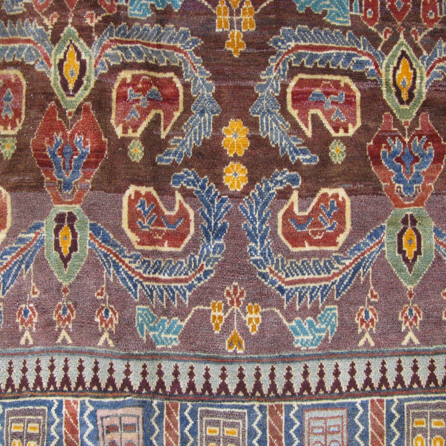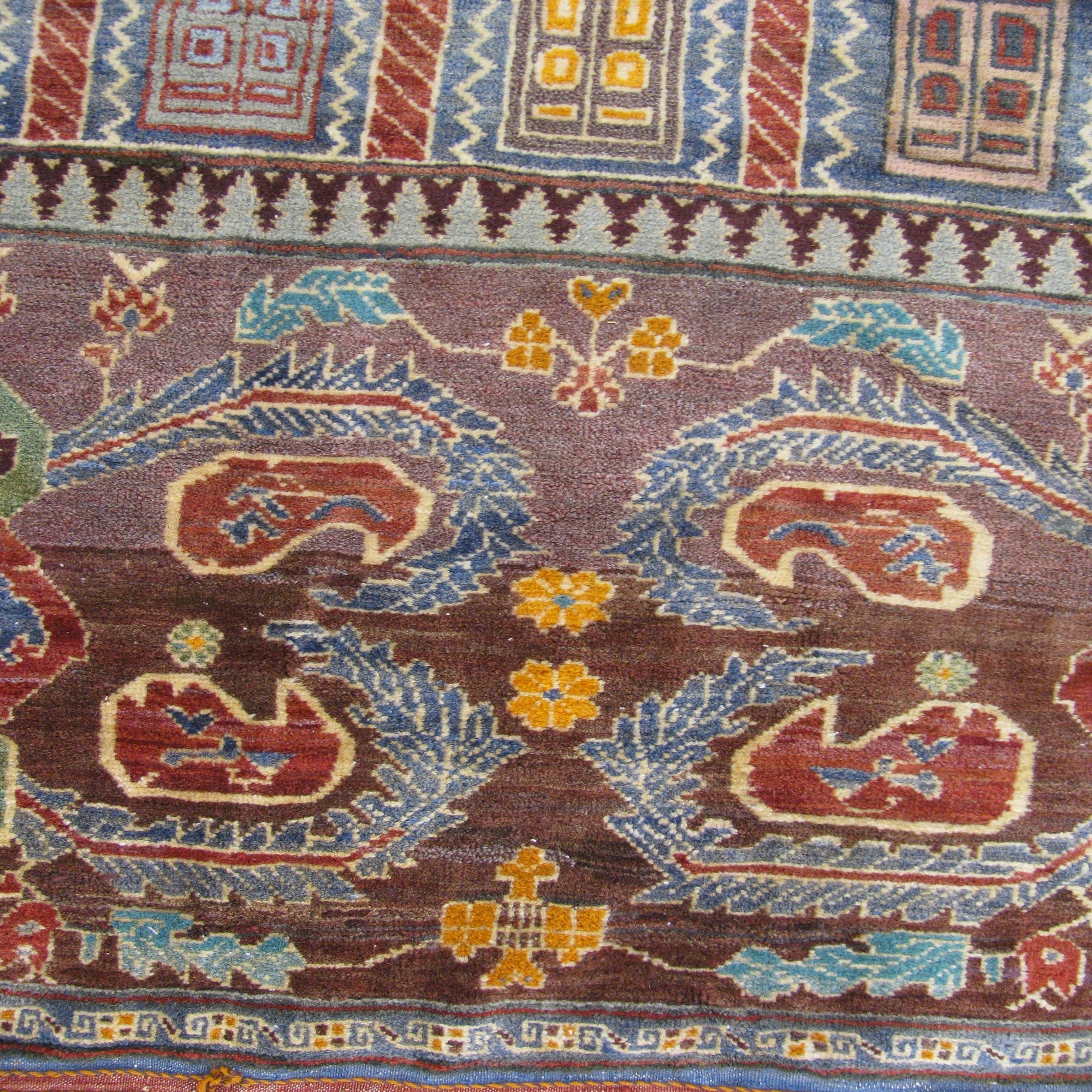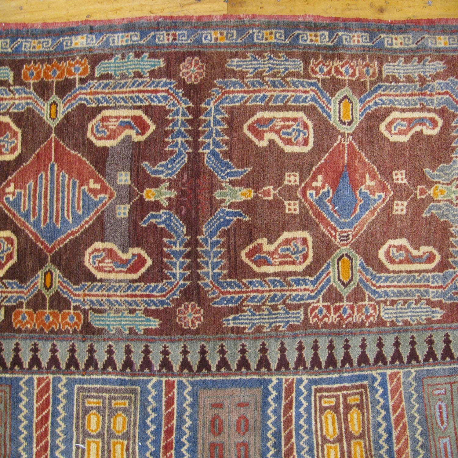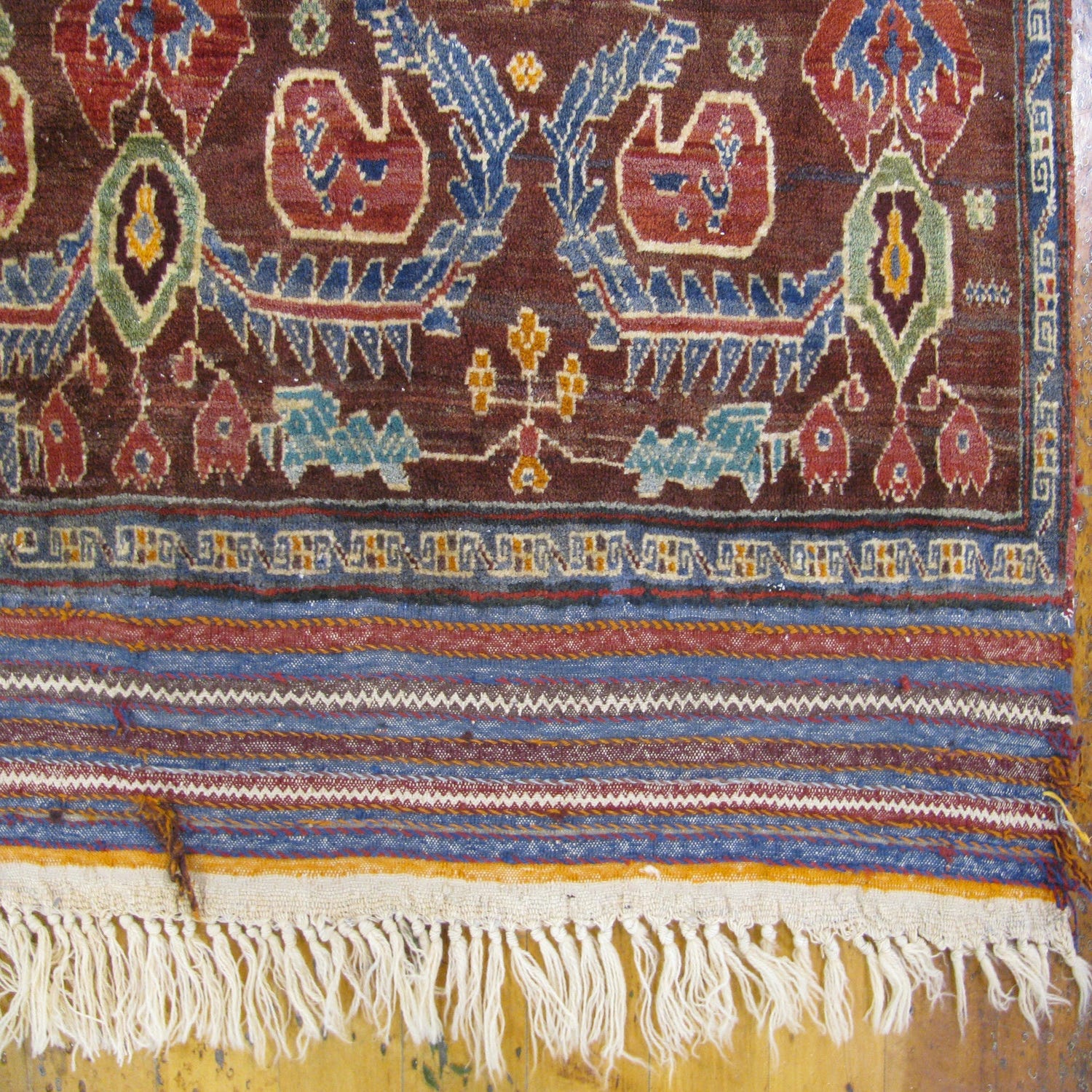 Primary color is Burgundy. Colors in this rug include: Burgundy, Blue, Brown, Green, Orange.