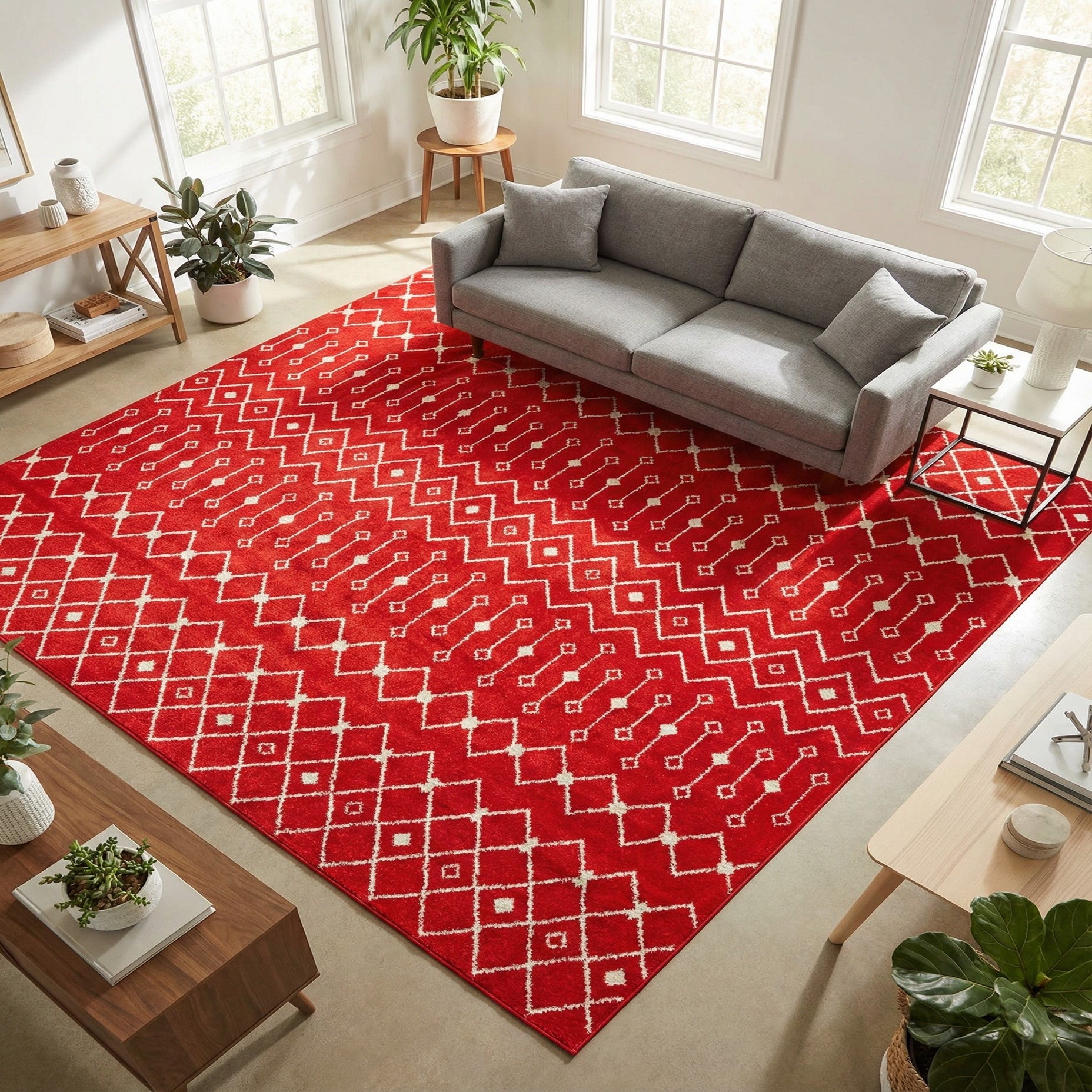 A rich Burgundy Red field sets the stage for a repeating ivory trellis motif that runs in horizontal bands across the surface. Diamonds, zigzags and linked-dot shapes create a rhythmic, Moroccan-inspired geometric pattern that brings clear, structured contrast to the deep background. Machine-made polypropylene construction gives the rug a low-to-medium pile with a soft, slightly cushioned hand and a subtle textural definition where the ivory pattern sits against the red field.