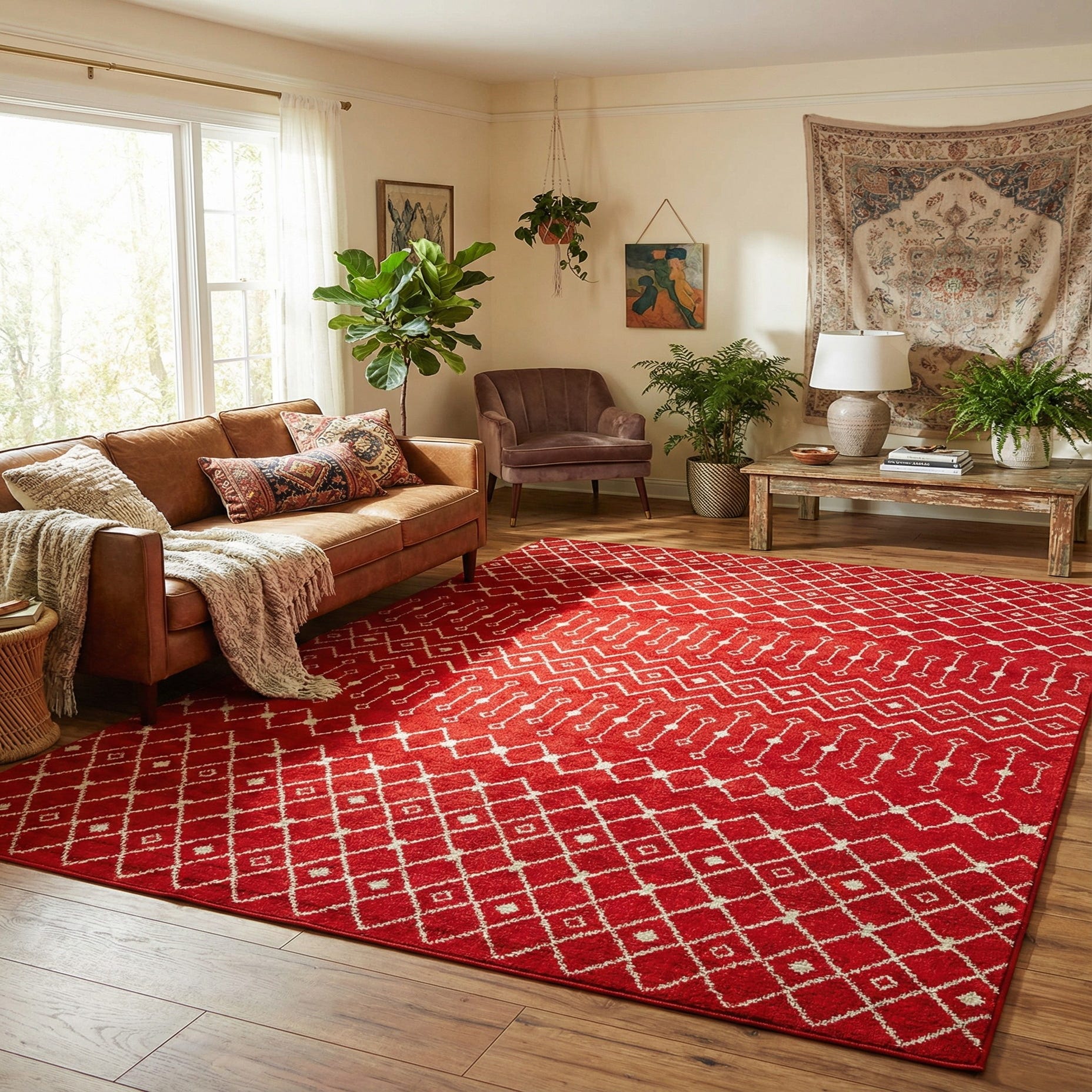 This rug fits well in a variety of interiors: place it beneath a living room seating group to introduce color and structure, under a dining table to frame the space, or layer it in a bedroom to add warmth beside the bed. It pairs naturally with warm wood tones, neutral upholstery, and metal accents in brass or matte black, and complements decor directions from contemporary and transitional to global-inspired and bohemian schemes.