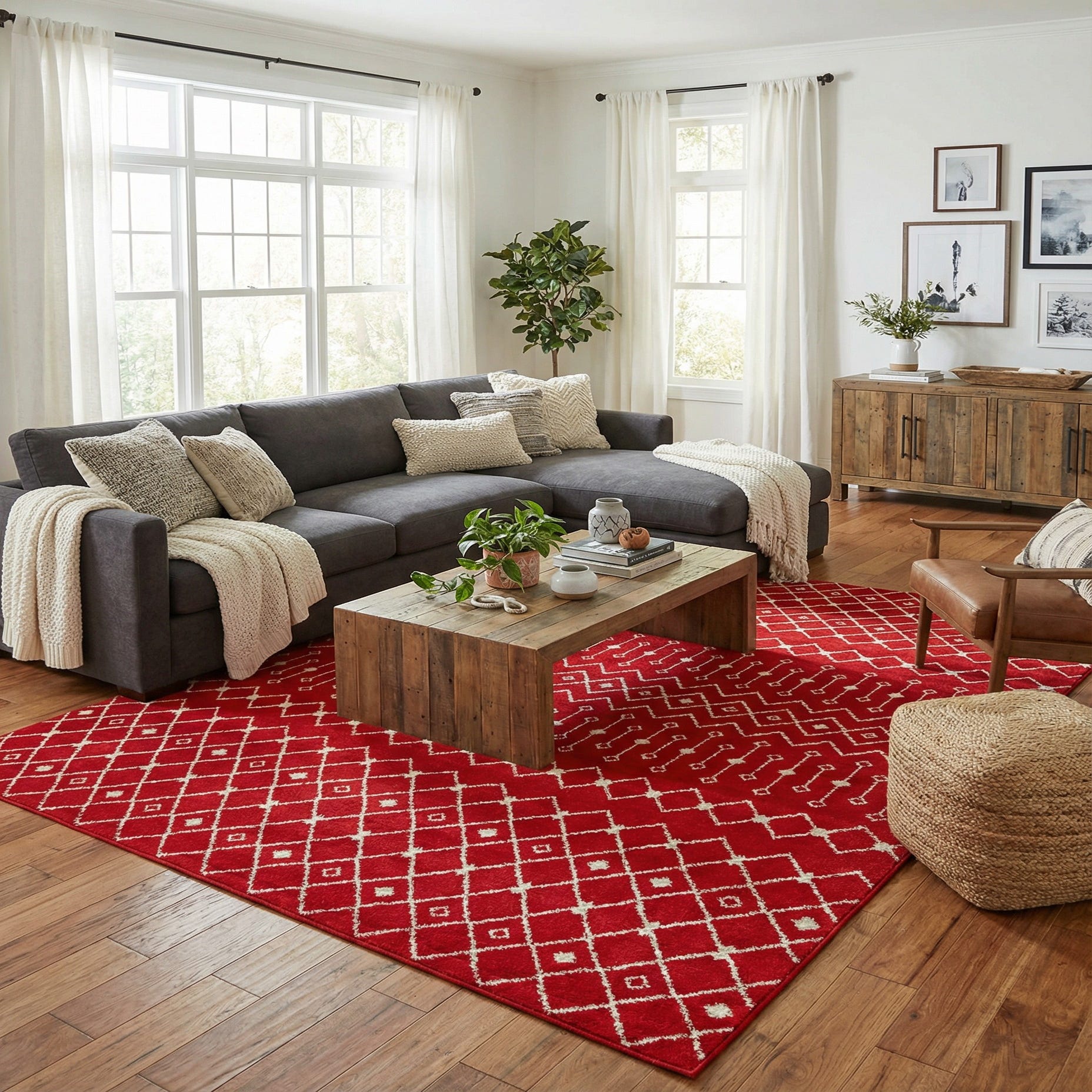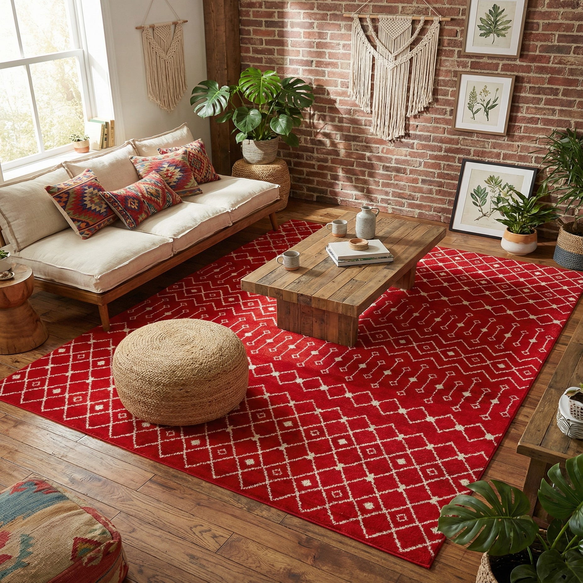 A rich Burgundy Red ground sets a warm, confident tone while an Ivory trellis pattern weaves across the surface in alternating bands of diamonds, zigzags and delicate linear motifs. The geometric layout channels Moroccan-inspired styling with a modern, graphic clarity—each Ivory element is crisply defined against the deep red, creating a balanced, rhythmic look that anchors a room without overwhelming it. The machine-made polypropylene construction offers a soft, slightly cushioned hand and a low-to-medium pile that holds the pattern definition well and presents a subtle, even surface underfoot.