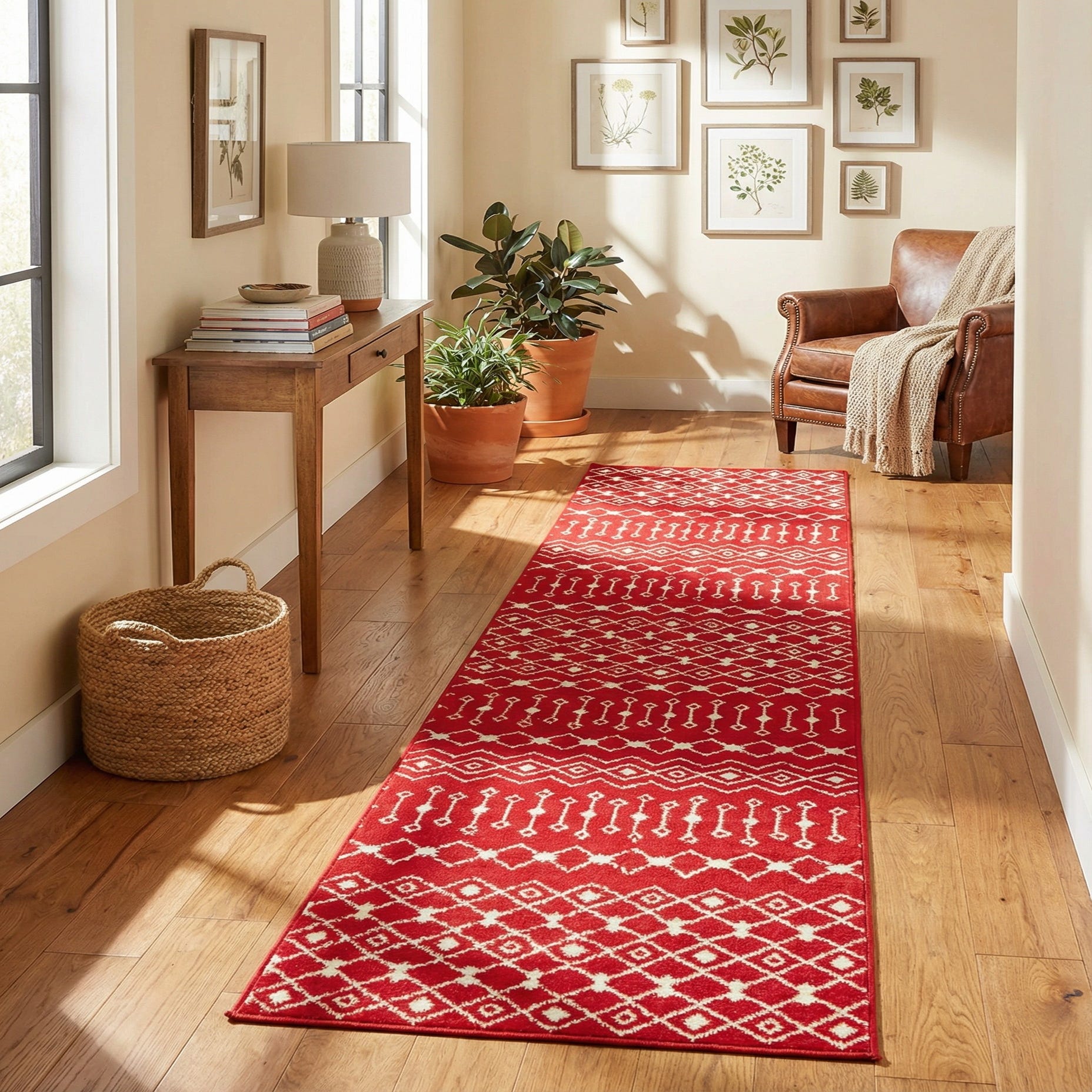 This runner brings color and pattern to long, narrow spaces such as hallways, entryways or alongside a bed. It complements warm wood tones and leather furnishings in traditional or transitional rooms, and it also pairs well with neutral upholstery and matte metal accents in more modern or eclectic interiors. Use it to anchor a foyer, add a lively stripe of color to a kitchen walkway, or layer it over natural-fiber rugs to introduce pattern without overwhelming a space.