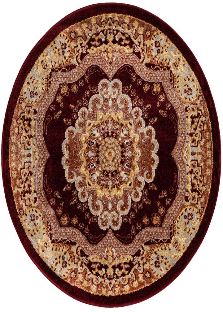 Primary color is Burgundy Red. Colors in this rug include: Burgundy Red, Gray, Ivory, Yellow, Terracotta.