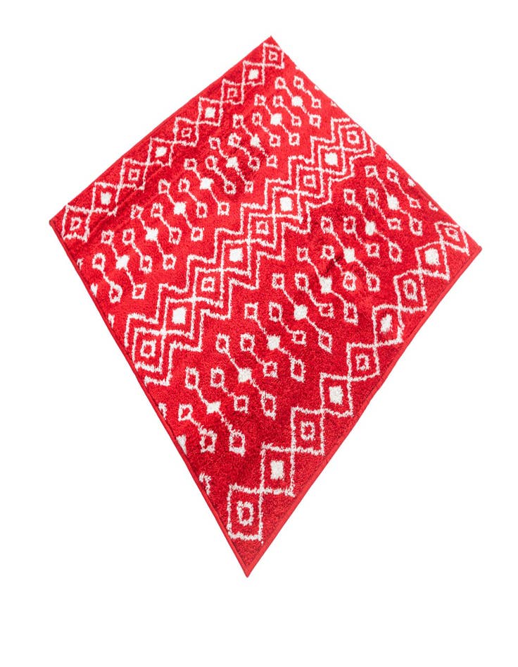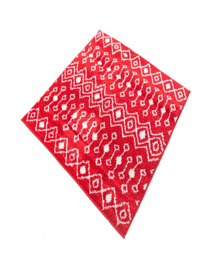 A 3' 3 x 3' 3 square red area rug with a white bohemian trellis pattern, featuring diamond and geometric motifs.