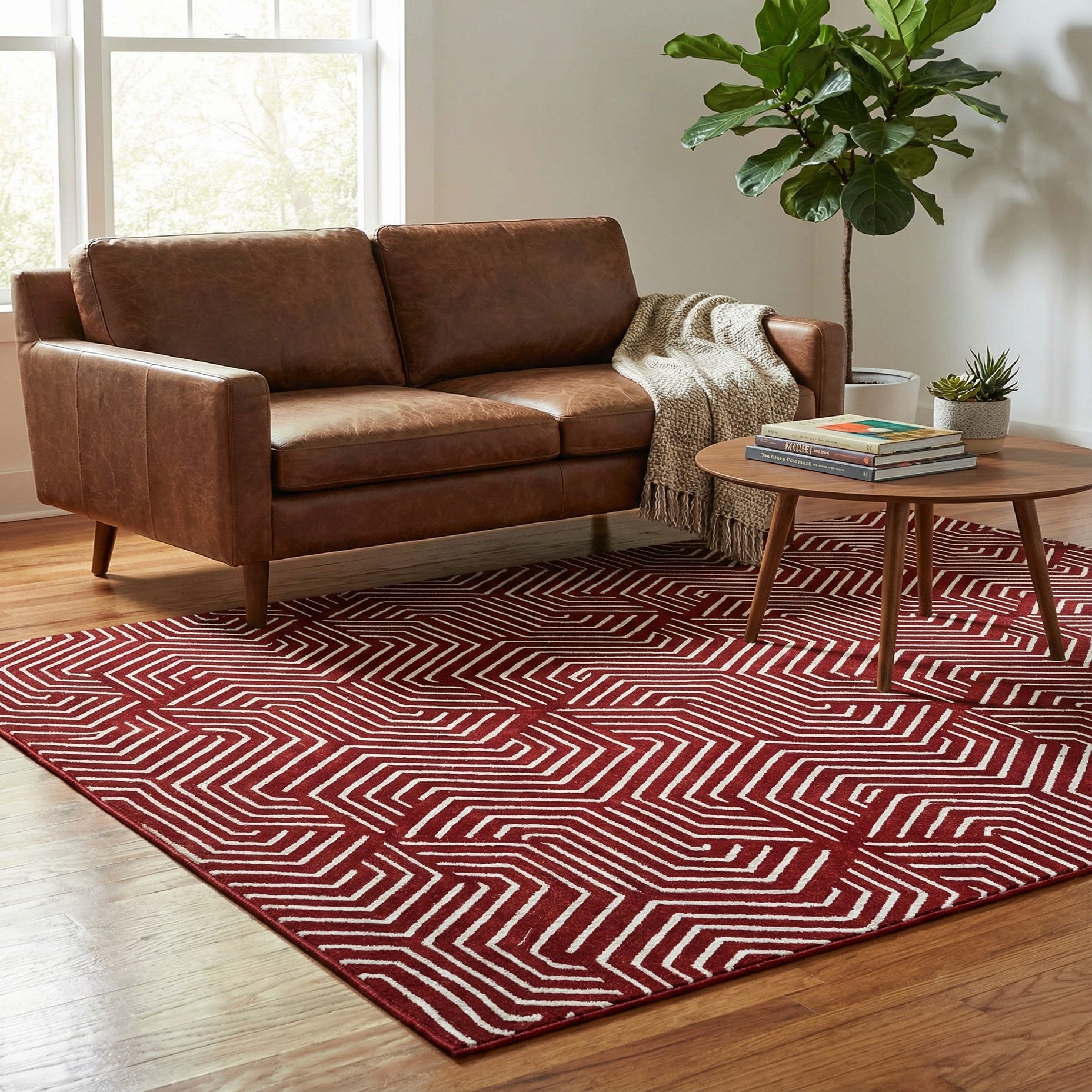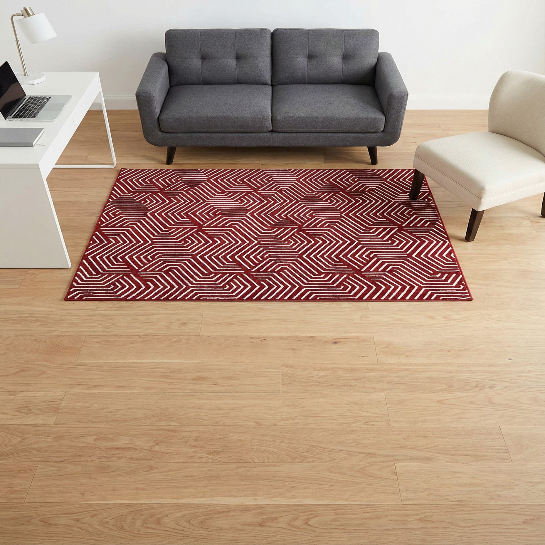 A bold geometric motif of interlocking angular lines in ivory sits against a rich burgundy red background, creating a rhythmic maze-like pattern with a contemporary edge. The crisp ivory stripes form repeating chevron and hexagonal shapes that give the rug a structured, graphic presence—an easy way to introduce color and pattern without overwhelming a room.