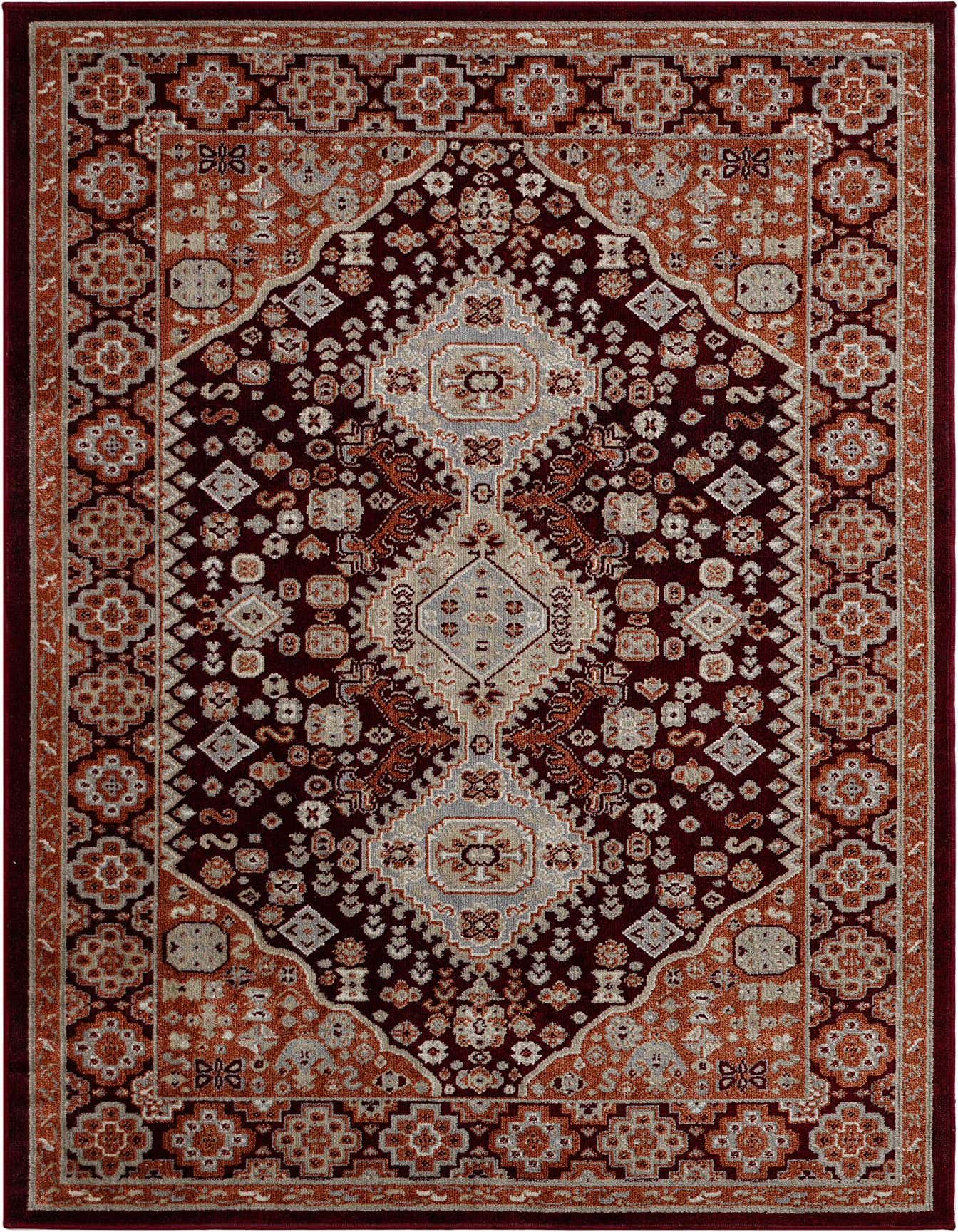 Primary color is Burgundy Red. Colors in this rug include: Burgundy Red, Gray, Ivory, Terracotta.