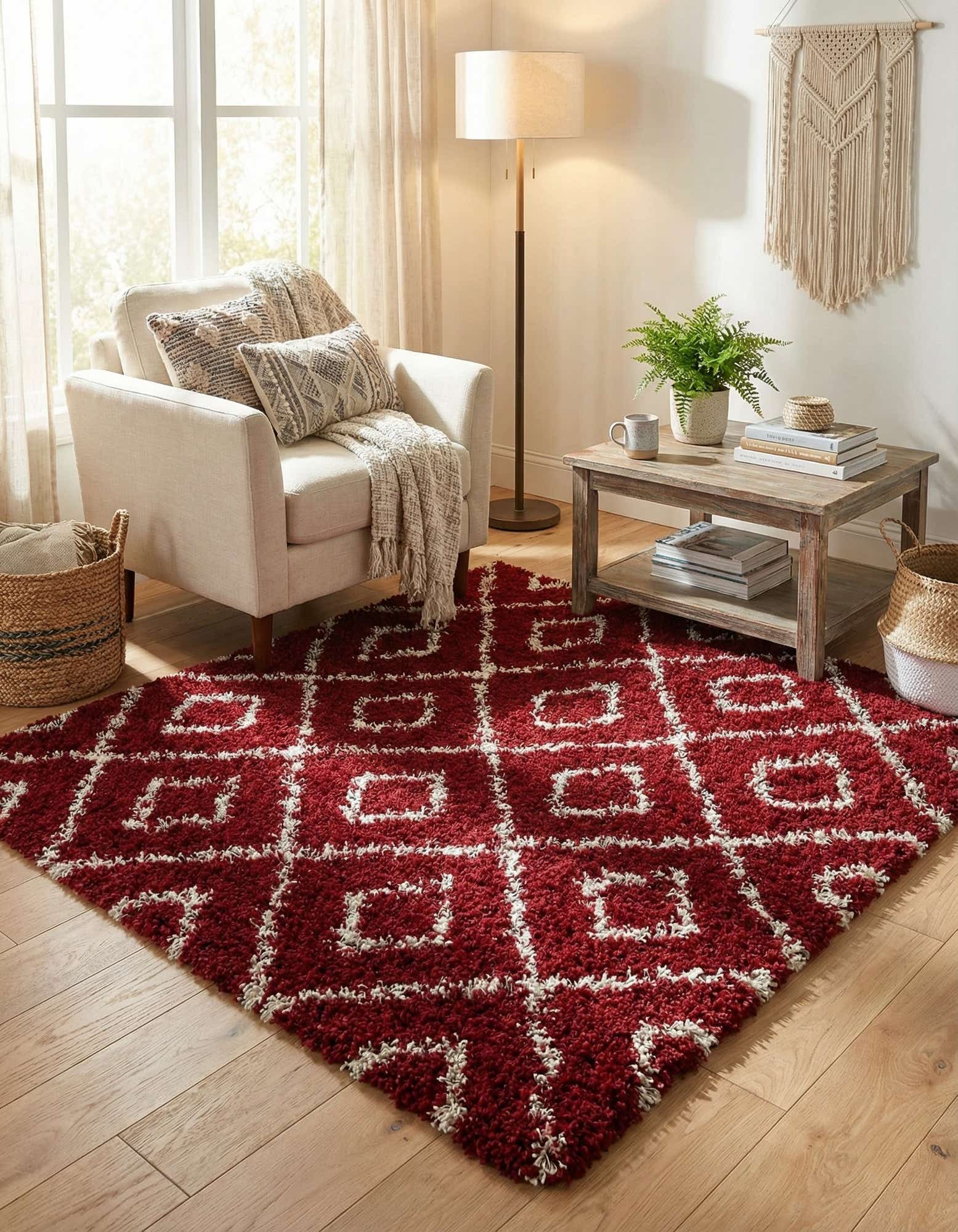 A deep burgundy red field anchors this shag rug, with a crisp ivory lattice of nested diamond motifs cutting across the pile. The machine-made construction and 100% polypropylene fibers produce a dense, plush texture that feels soft and springy underfoot while the higher ivory loops add a tactile contrast against the rich red background. The geometric pattern reads modern with a hint of traditional influence, giving the rug visual structure without overpowering a room.