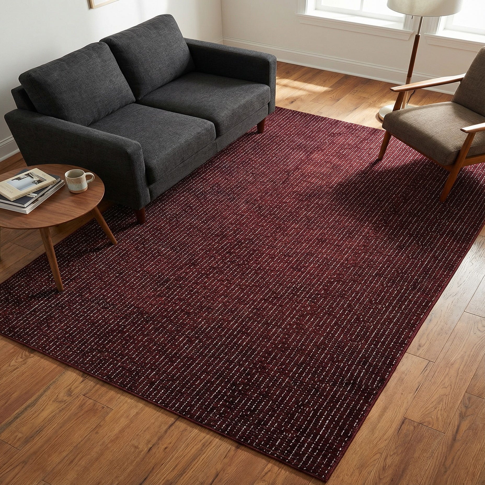 A deep Burgundy Red field is patterned with a restrained ivory dash-and-grid motif that gives the surface subtle movement without dominating a room. The short, linear marks create a modern, woven effect with a quiet geometric rhythm. Machine-made of 85% polypropylene and 15% chenille, the construction balances a soft, velvety hand from the chenille yarn with the dimensional stability and low-pile feel that polypropylene provides.