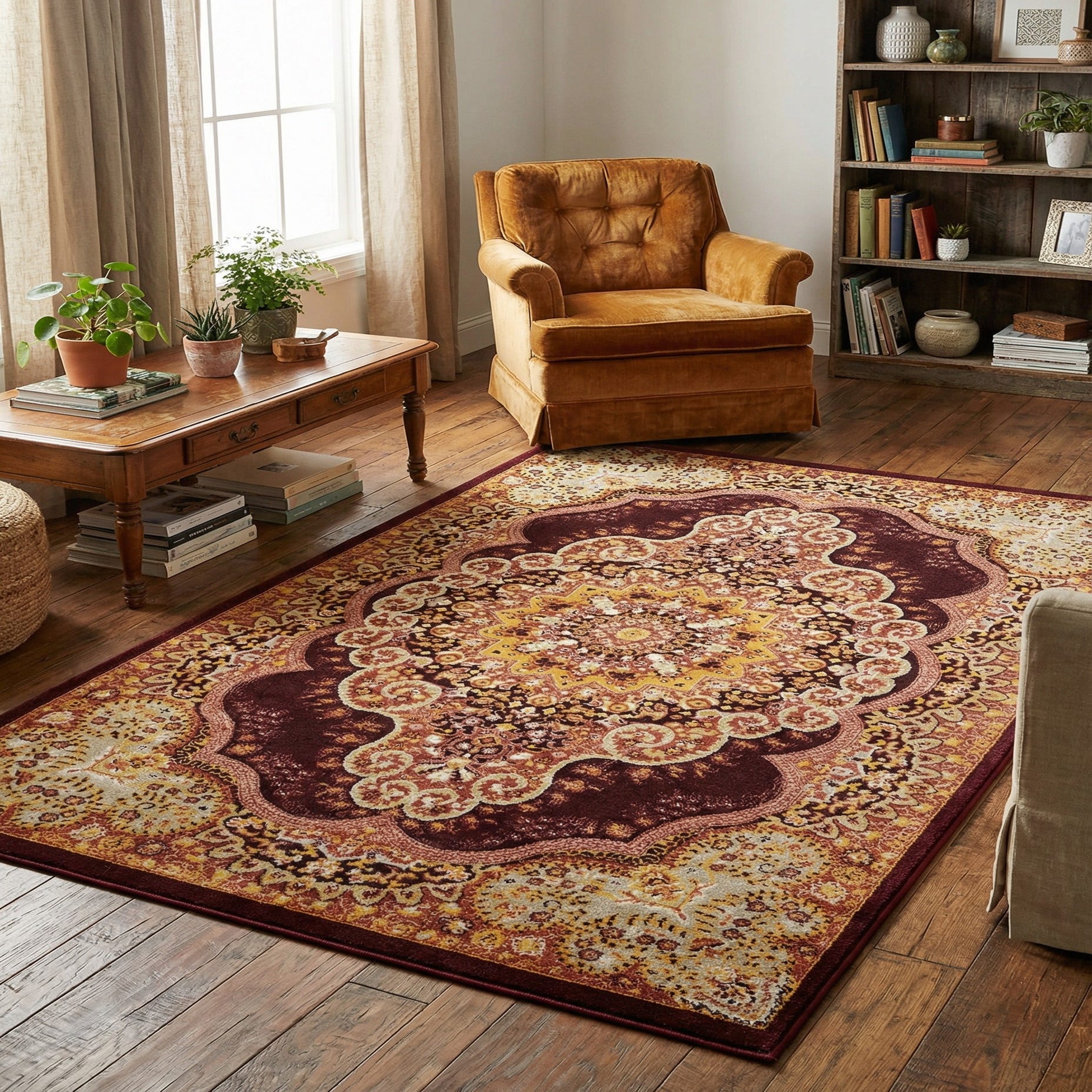 Primary color is Burgundy Red. Colors in this rug include: Burgundy Red, Gray, Ivory, Terracotta, Yellow.