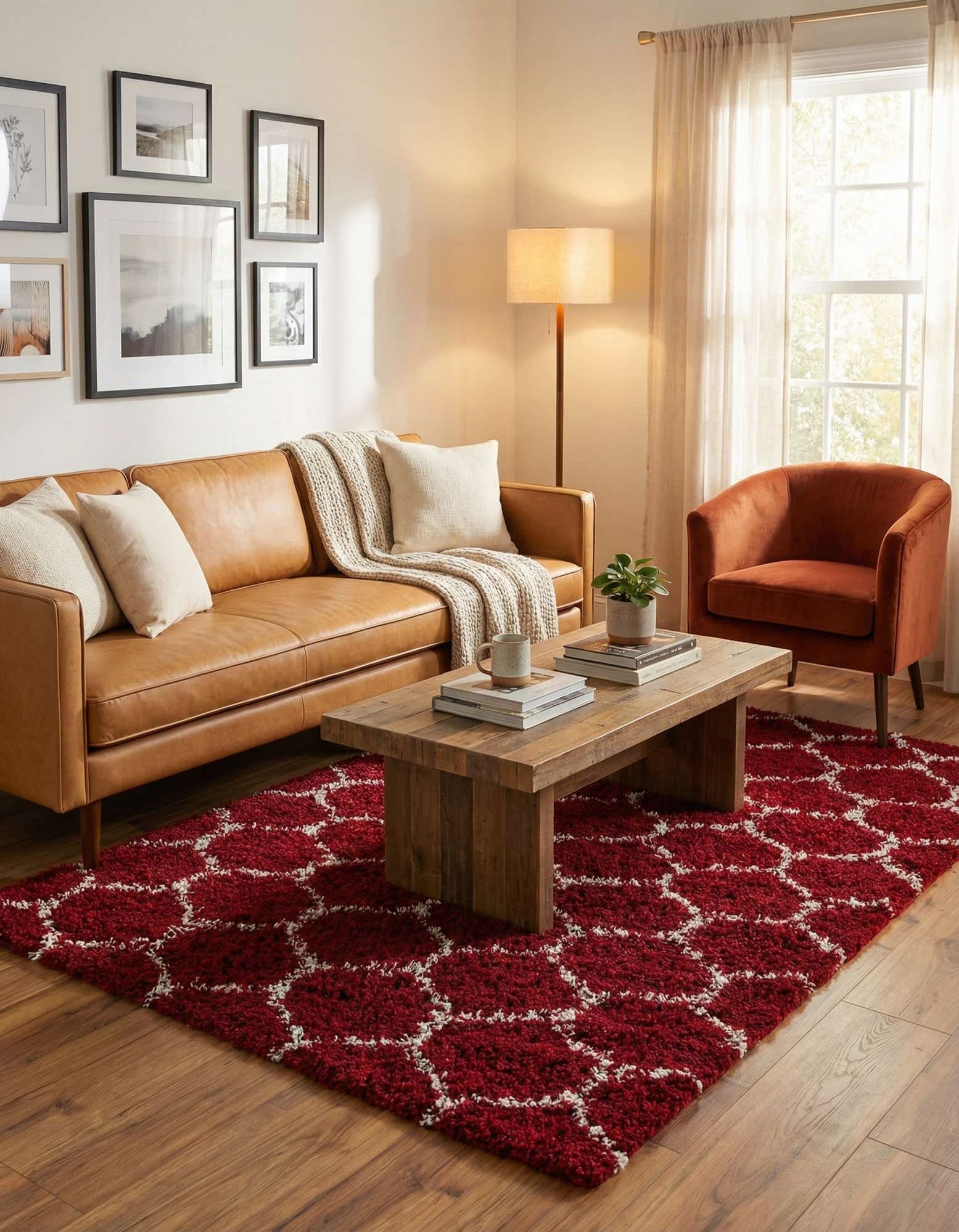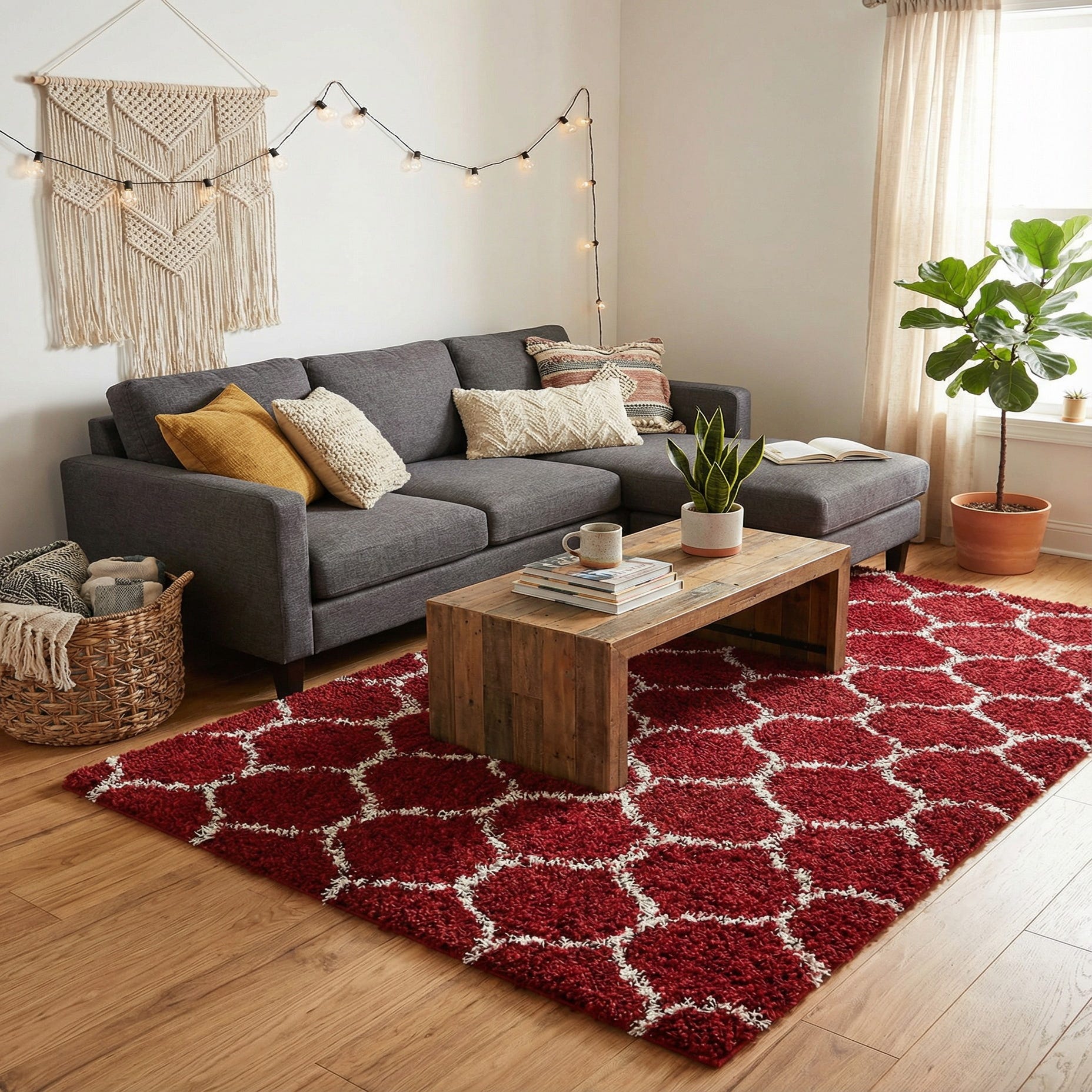 A 5x8 rectangular red shag rug with a modern white lattice pattern, showcasing its textured high/low pile.