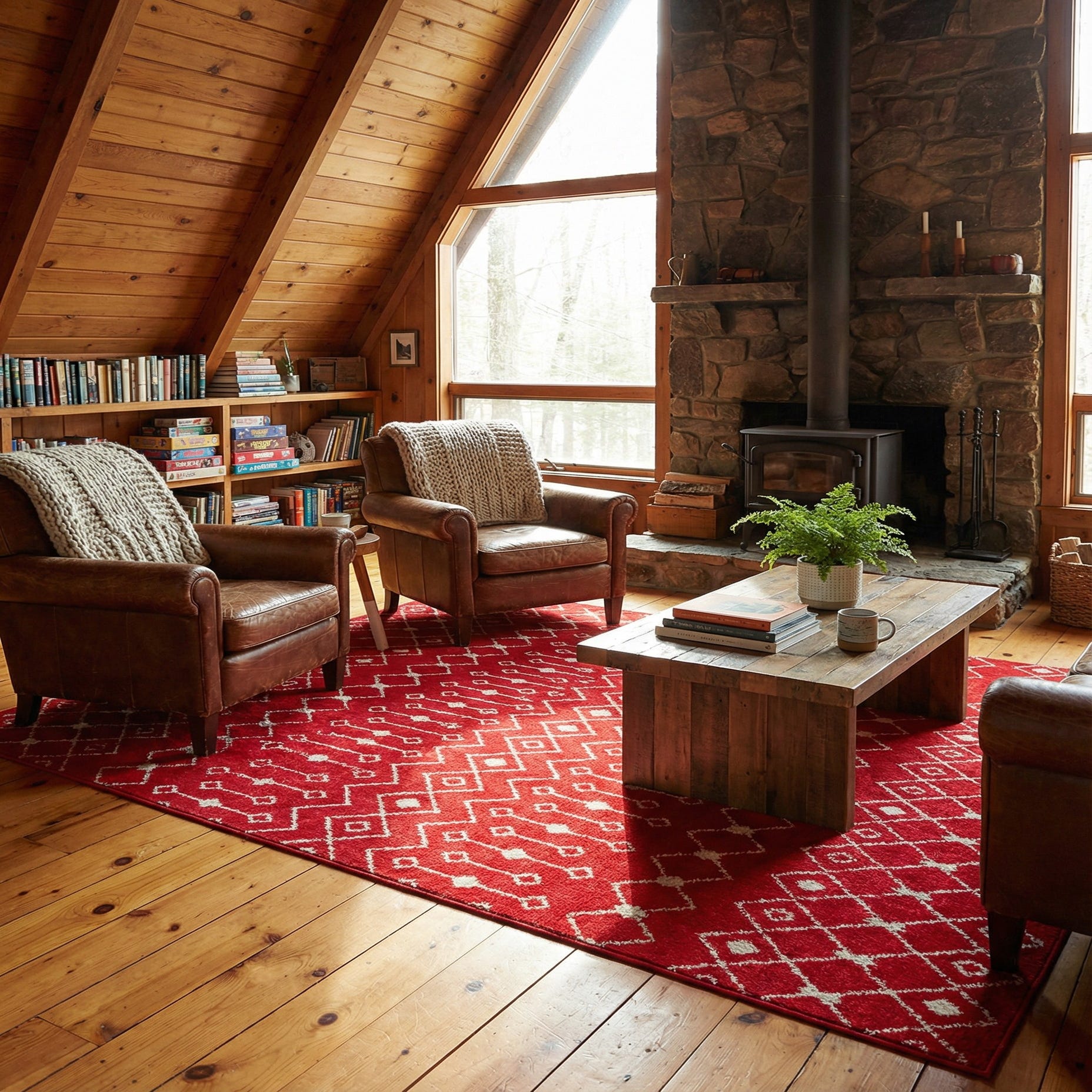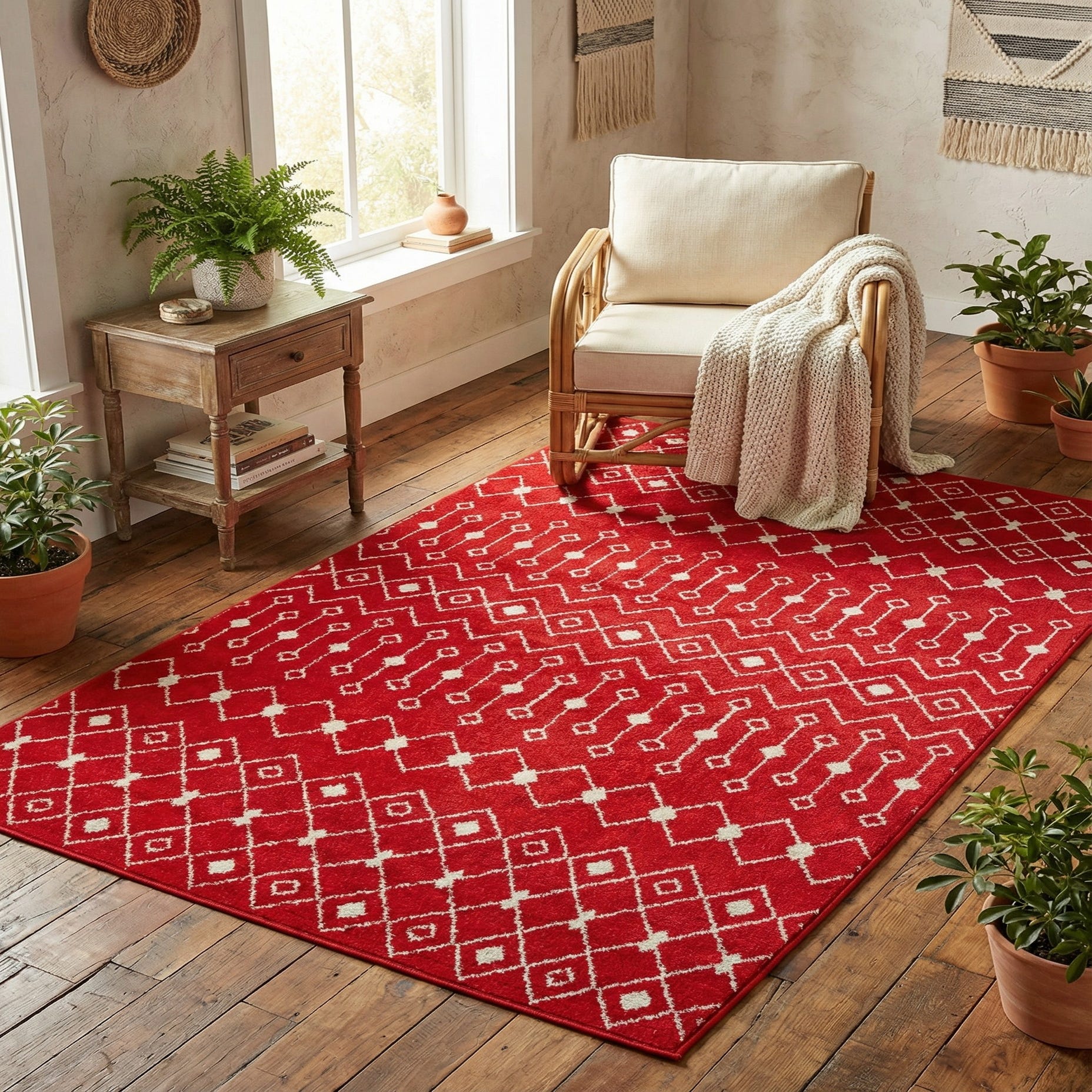 A bold geometric trellis runs across a deep Burgundy Red field, rendered in crisp Ivory. Alternating rows of interlocking diamonds and vertical beaded lines create a rhythmic, Moroccan-inspired motif that brings clear pattern and movement to the floor. The machine-made polypropylene pile is dense and low-profile with a soft hand; the Ivory pattern has a slightly raised texture against the smooth burgundy background for subtle contrast underfoot.