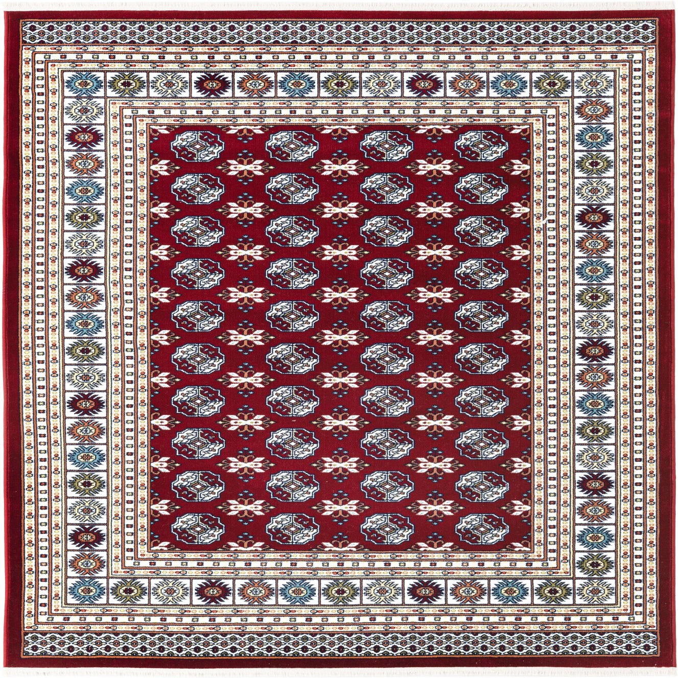 A rich Burgundy Red field sets the stage for a traditional, repeating medallion pattern rendered in ivory, navy blue and accents of sky Blue. The center is filled with evenly spaced octagonal motifs and delicate floral interlocks, while multiple guard borders in ivory layer around the perimeter with alternating rosette and geometric bands. Short ivory fringe at the ends frames the composition and reinforces the rug’s classic, formal look.