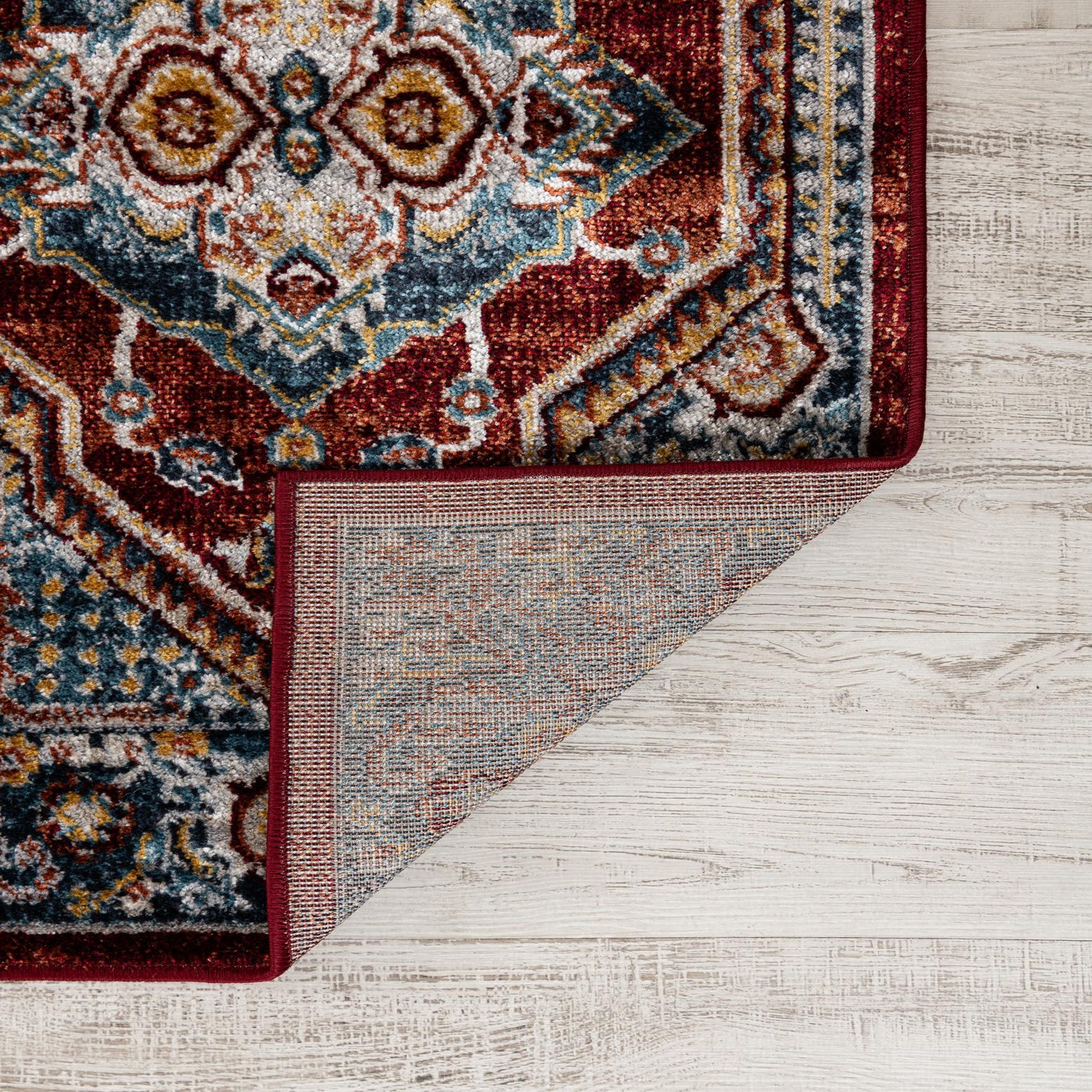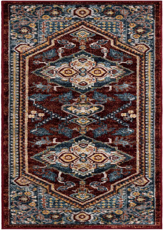 Primary color is Burgundy Red. Colors in this rug include: Burgundy Red, Beige, Blue, Gray, Ivory, Red, Yellow, Terracotta, Navy Blue.