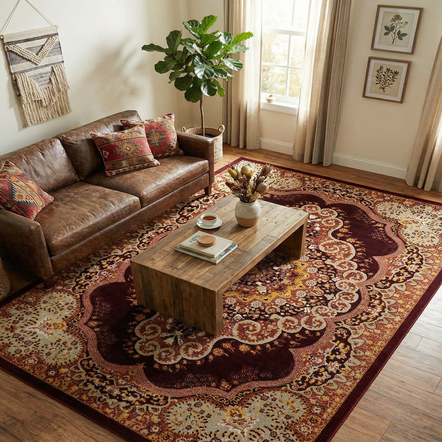 Primary color is Burgundy Red. Colors in this rug include: Burgundy Red, Gray, Ivory, Terracotta, Yellow.
