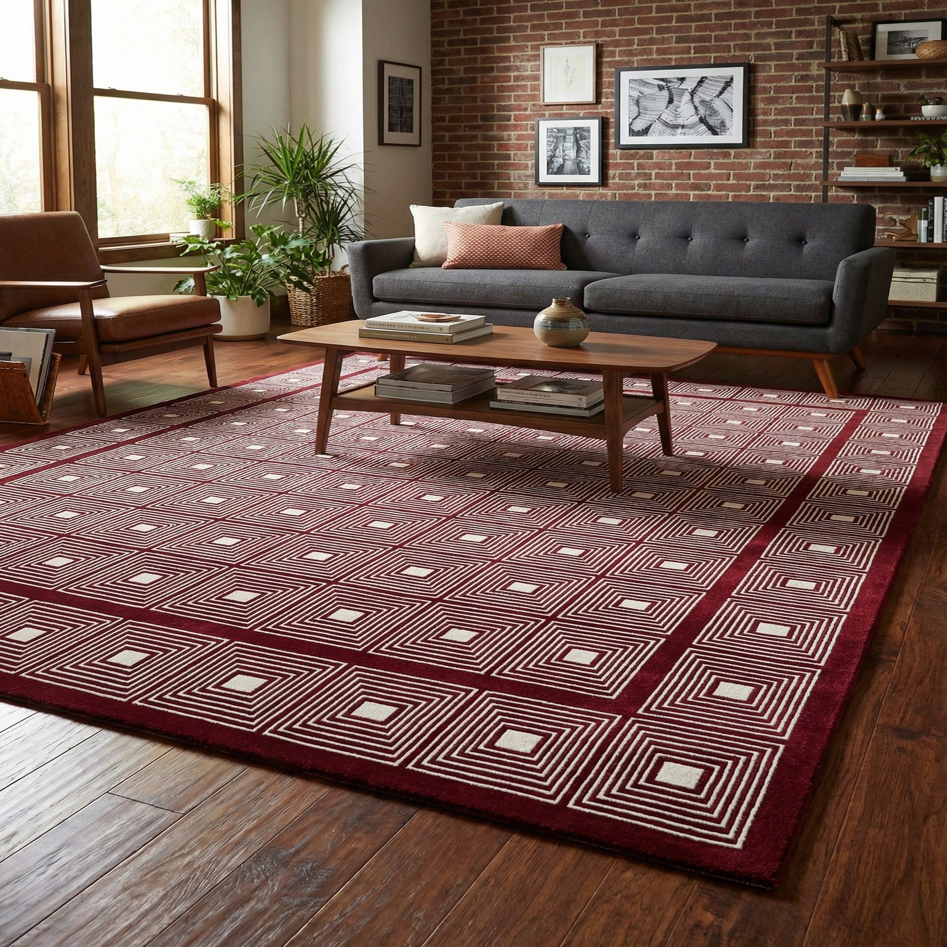 A graphic field of concentric ivory squares sits against a rich burgundy red background, forming a disciplined grid that repeats across the surface and continues into a matching square border. The clean, geometric motif brings a contemporary yet classic sensibility—crisp ivory lines create strong contrast and clear sightlines, while the overall layout reads orderly and refined. The pattern works as a focal point without overwhelming a room, offering visual structure that complements both pared-back and layered interiors.