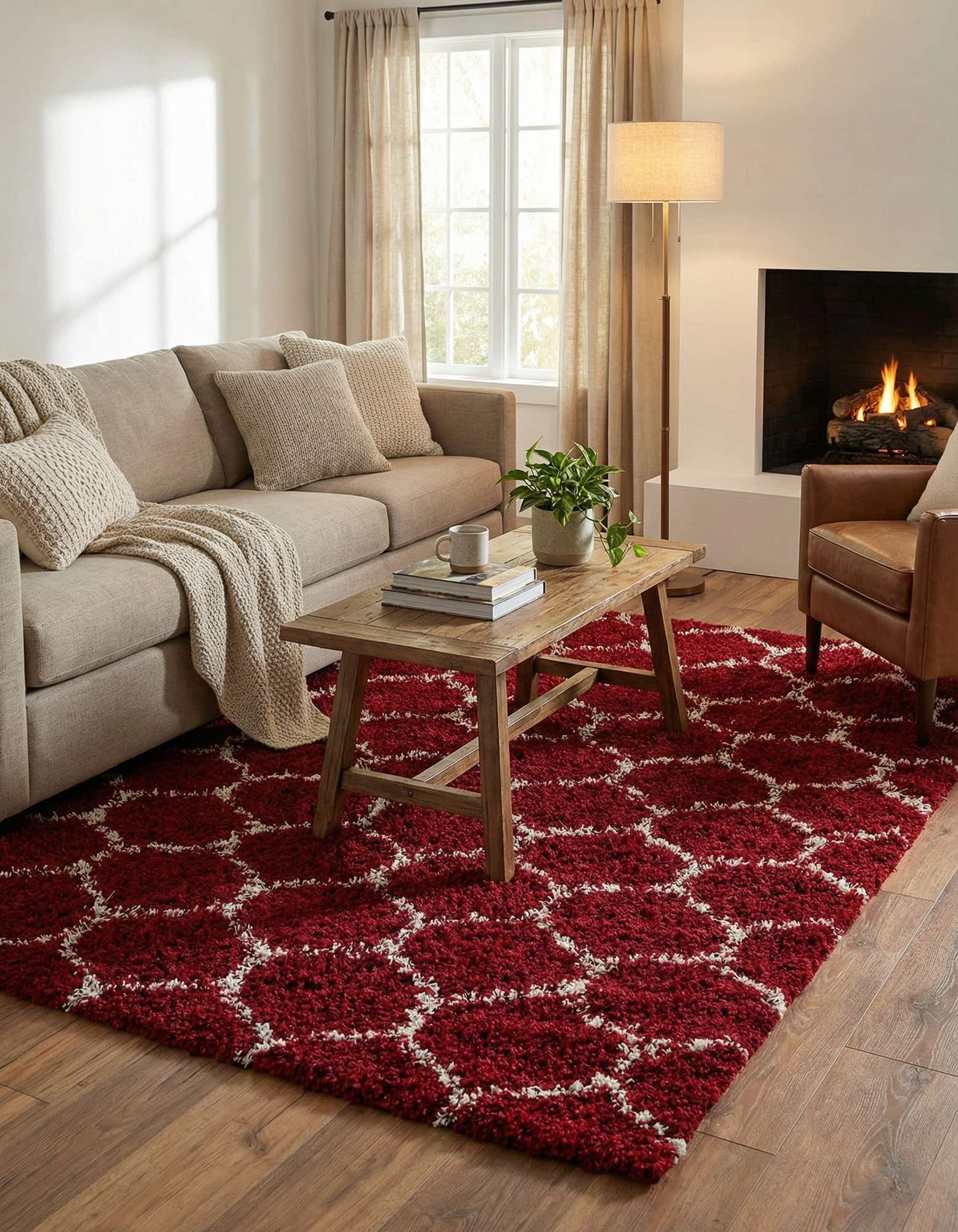 A bold lattice pattern of rounded trellis motifs in ivory sits against a rich burgundy red background, creating a clear, graphic look that balances traditional and contemporary sensibilities. The shag pile is plush and dense, with a soft, slightly shaggy texture that invites bare feet and adds visual depth as the pile catches light. Machine-made from 100% polypropylene, the rug delivers durable color and a consistent finish while maintaining a comfortable, cushioned hand.