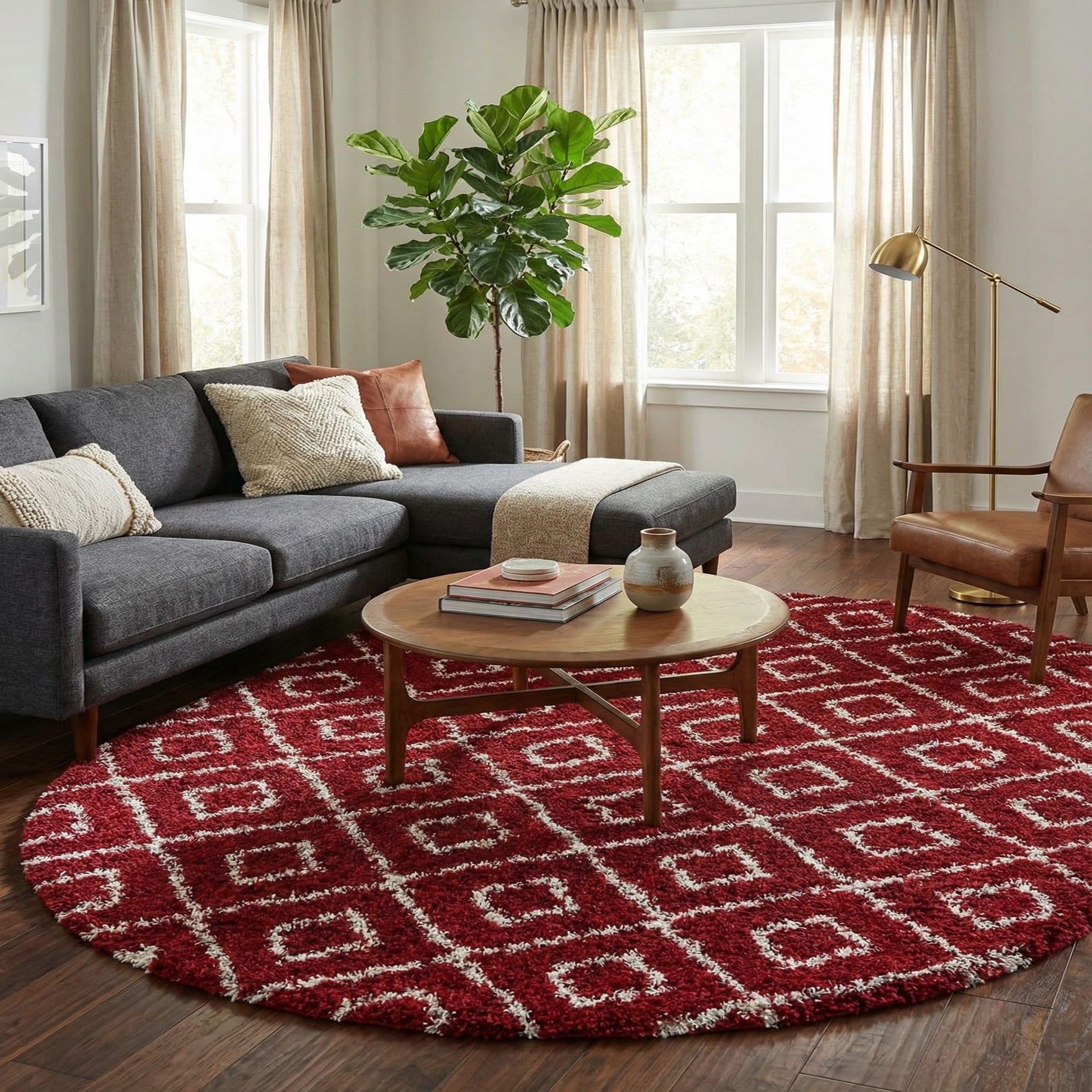 Deep burgundy red forms the backdrop for a crisp geometric lattice of cream square-in-square motifs, creating a graphic yet approachable pattern. The shag pile is soft and tactile, with a slightly uneven, textured surface that gives the design added depth and movement when you run your hand across it. Machine-made from 100% polypropylene, the construction keeps the pile consistent across the oval silhouette while maintaining that plush, inviting feel underfoot.