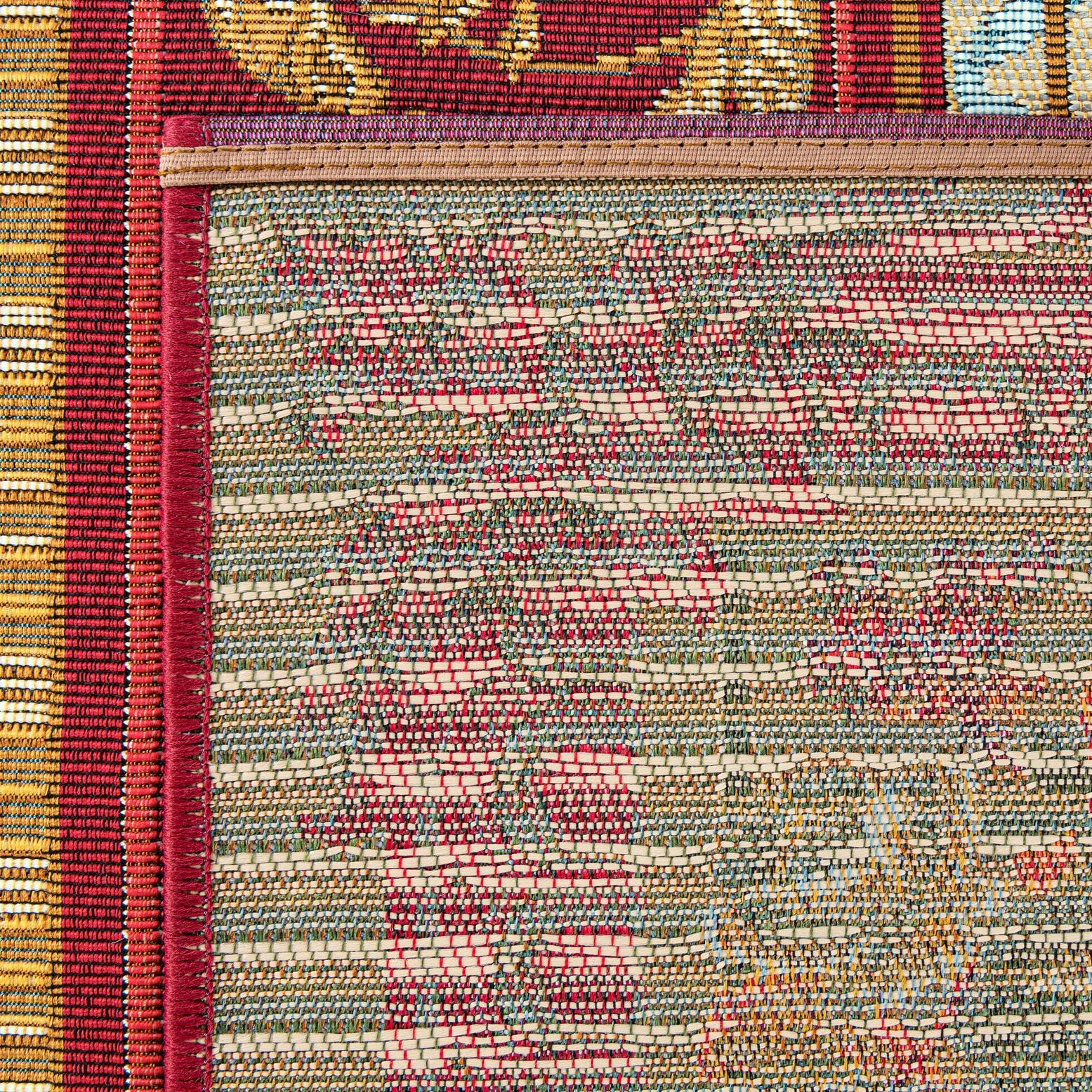 This Outdoor Traditional collection runner rug measures 10 feet in length and showcases a harmonious blend of burgundy red and ivory as its primary color scheme. The flatweave construction presents an elegant array of floral patterns, with intricate detailing in gold, green, pink, and red, adding depth and character to the design. The rich burgundy red border frames the ivory background, resulting in a traditional aesthetic with a timeless appeal.