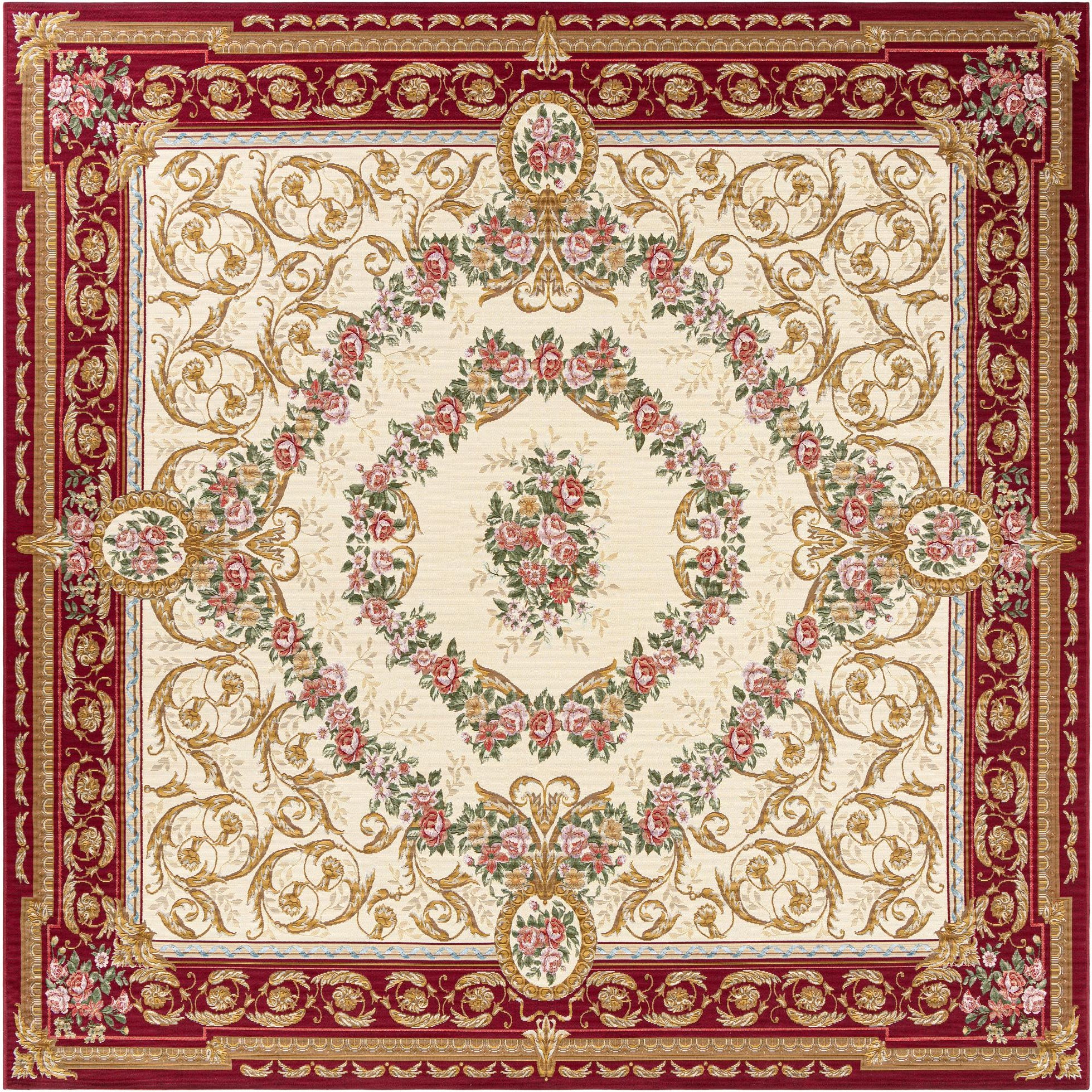 A 10'x10' square ivory and red Oriental rug with a central floral medallion and ornate border, ideal for a patio.