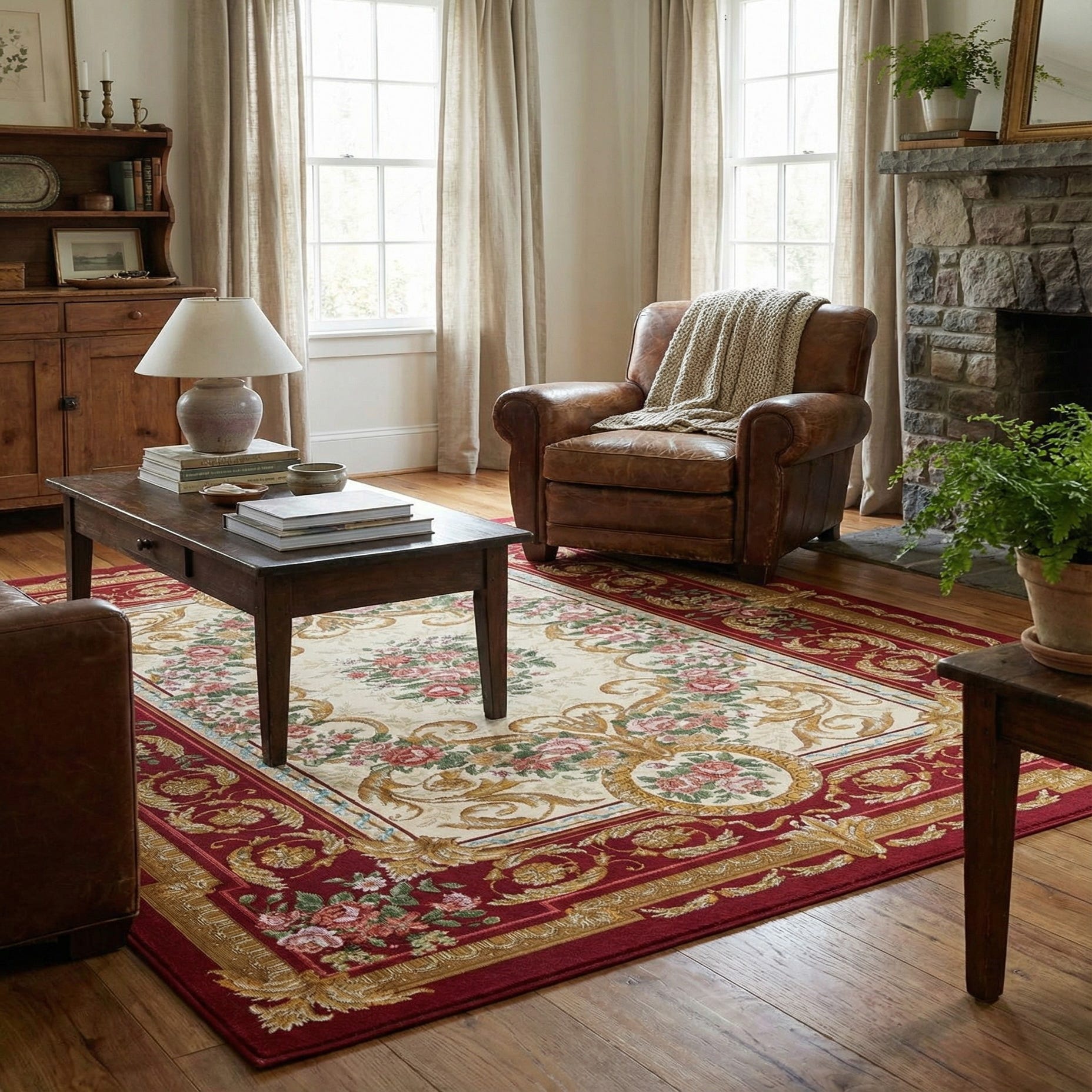 A classic traditional layout anchors this rug: an Ivory central field holds an ornate floral medallion and scrolling gold acanthus work, all framed by a rich Burgundy Red border. Pink and red roses with green foliage punctuate the design, while gold detailing and small ivory accents add layered contrast. The background uses Burgundy Red and Ivory, creating a formal, balanced look that reads equally at a distance or up close.