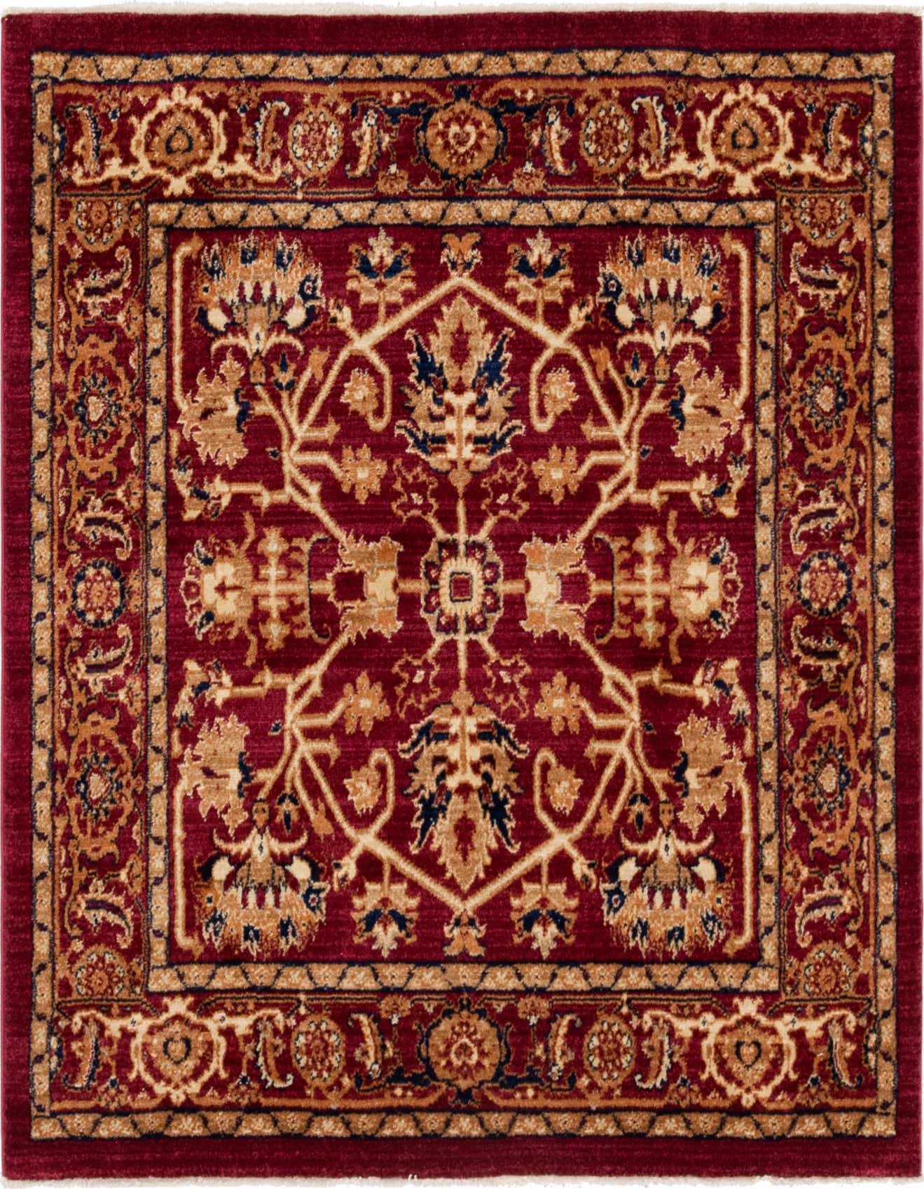 Primary color is Burgundy. Colors in this rug include: Burgundy, Beige, Gold, Ivory, Navy Blue, Orange, Tan.