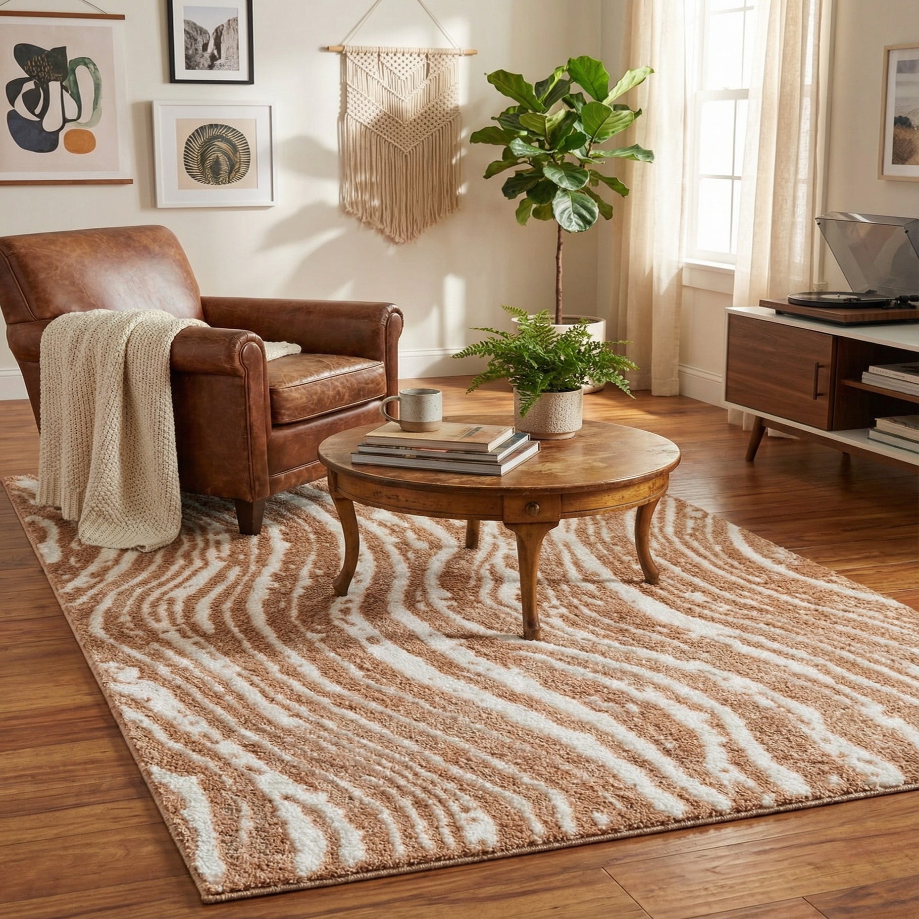 This versatile design works well layered beneath a coffee table to warm a neutral living room, placed at the foot of a bed to add subtle pattern to a calm bedroom, or used in a cozy reading nook alongside natural wood furniture and woven accents. It complements modern farmhouse, transitional, and contemporary interiors, and pairs nicely with warm metals, rattan pieces, and linen upholstery for a relaxed, cohesive look.