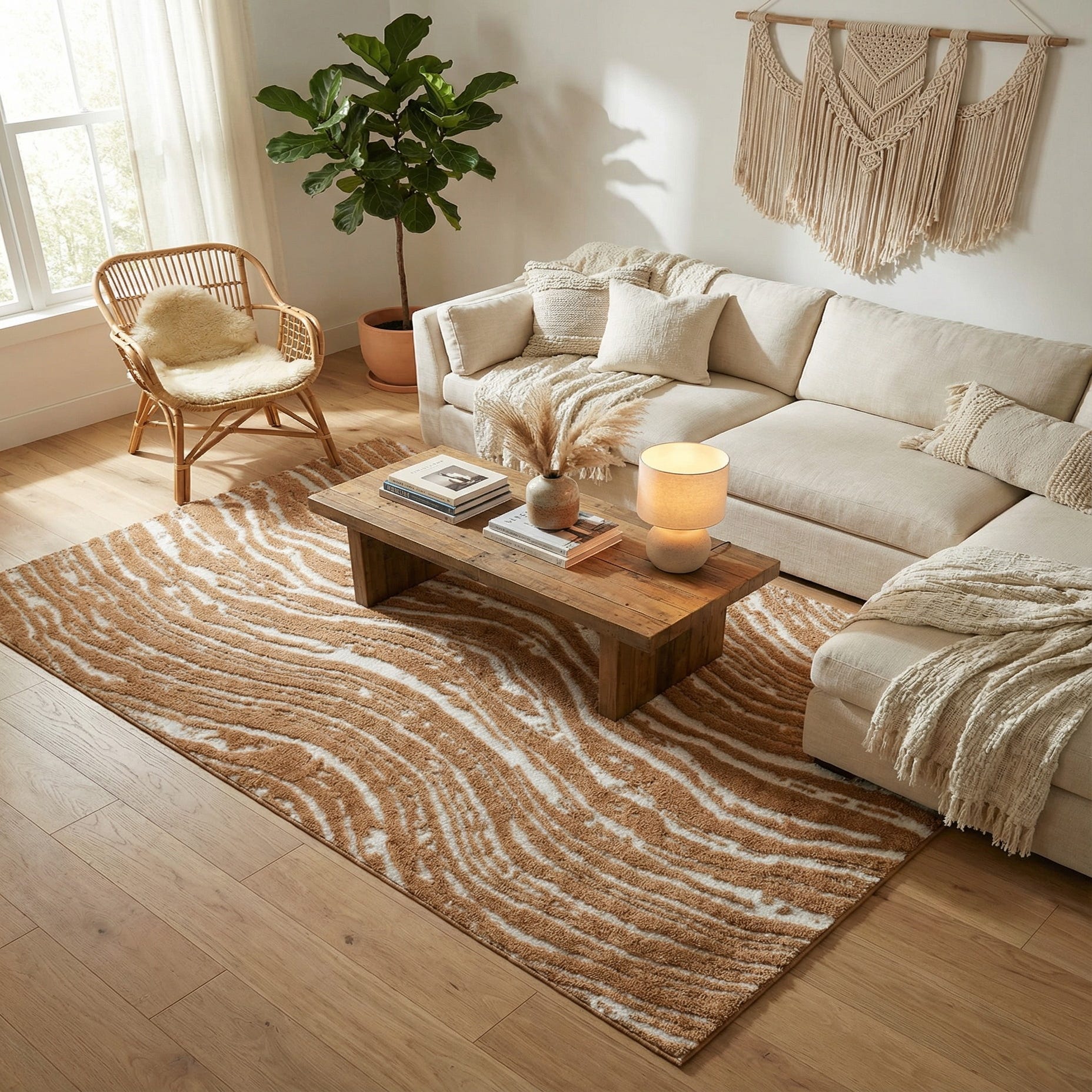 Works well in a variety of interiors: place it beneath a low-profile sofa and coffee table to anchor a contemporary living room, pair it with light wood furniture and rattan accents for a relaxed coastal or bohemian vibe, or layer it in a bedroom with linen bedding and warm metallic finishes for a cozy, transitional look. The neutral caramel-and-ivory palette coordinates easily with natural textures, muted blues, or deep greens to add subtle movement and warmth to the space.