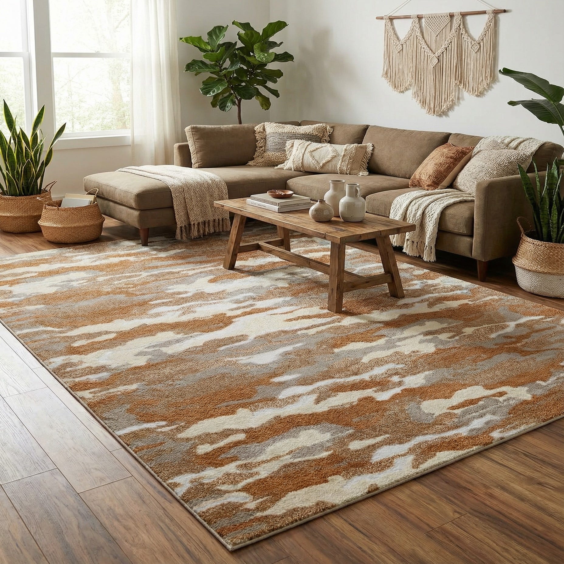Primary color is Caramel and Ivory. Colors in this rug include: Caramel and Ivory, Gray.