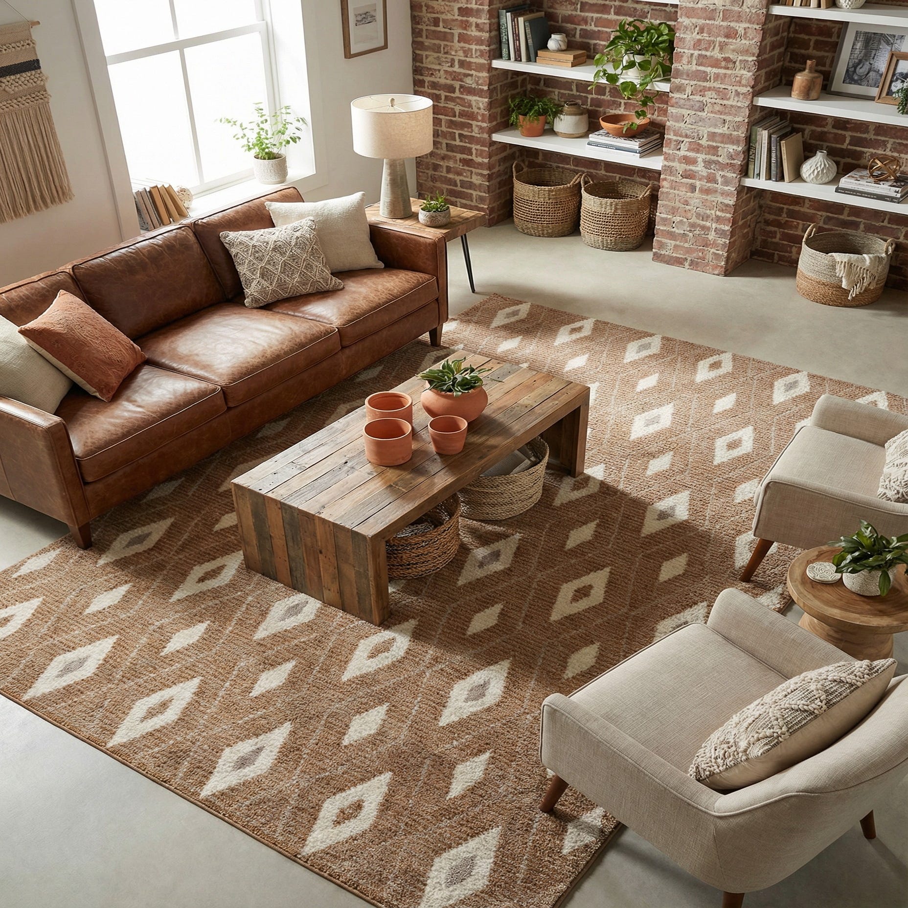 This neutral palette and clean pattern work well in a range of settings — place it under a sofa to define a living area, layer it beneath a dining table to add warmth without competing with tableware, or use it in a bedroom to anchor a calming, natural scheme. It pairs nicely with light woods, rattan, linen upholstery, and muted metal accents, and suits transitional, coastal, Scandinavian, or modern farmhouse interiors.