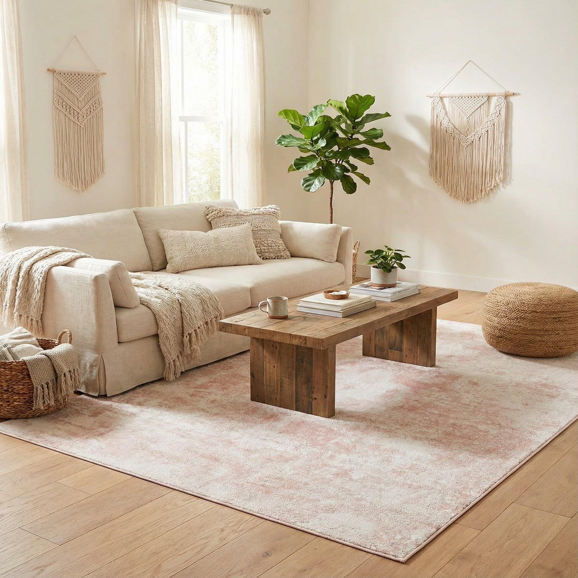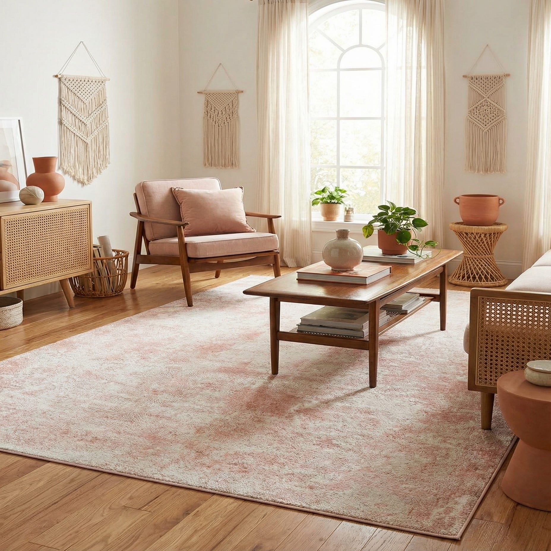 A soft, low?pile area rug in a warm Carnation Pink ground with an airy ivory wash and a subtle, painterly mottled pattern. The abstract, distressed motif creates gentle tonal shifts across the surface, giving the rug a lived?in, layered look. Machine made of 100% polypropylene, it has a smooth, velvety hand and a low profile that reflects light softly and stays visually light in a room.