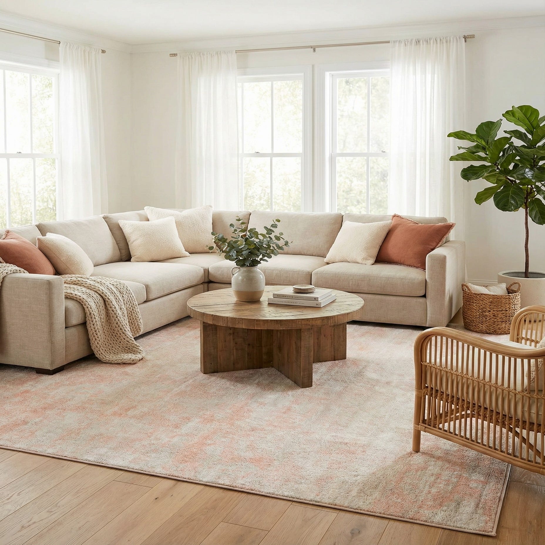 A soft, painterly field of carnation pink provides the background while ivory washes and subtle distressing drift across the surface, creating a muted, contemporary look rather than a defined motif. The pattern reads like a gentle watercolor—low-contrast and refined—making it a quiet anchor for a room without competing with other elements. Machine-made from 100% polypropylene, the low-profile pile has a smooth, slightly velvety hand and a low sheen that picks up light to emphasize the blended colorwork.