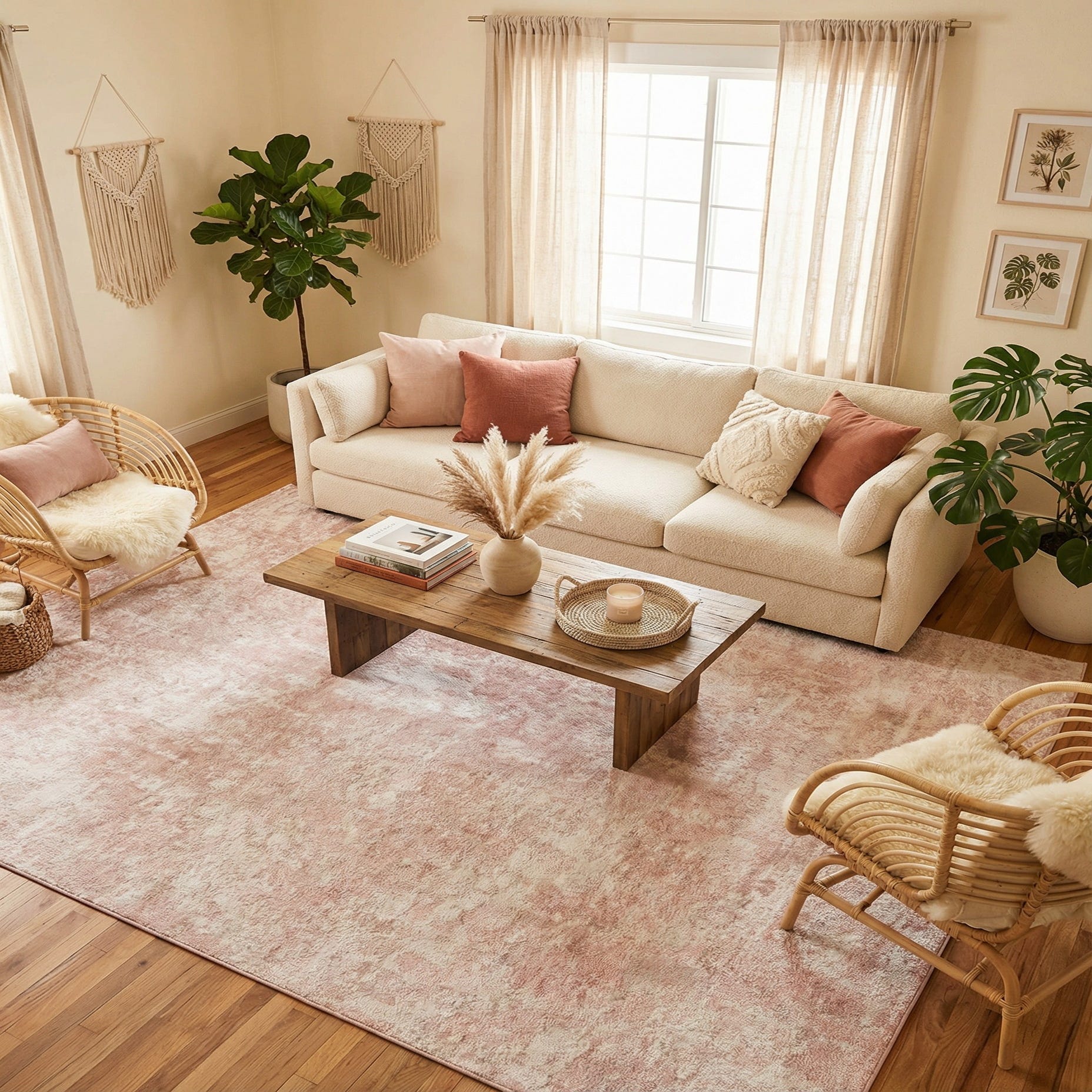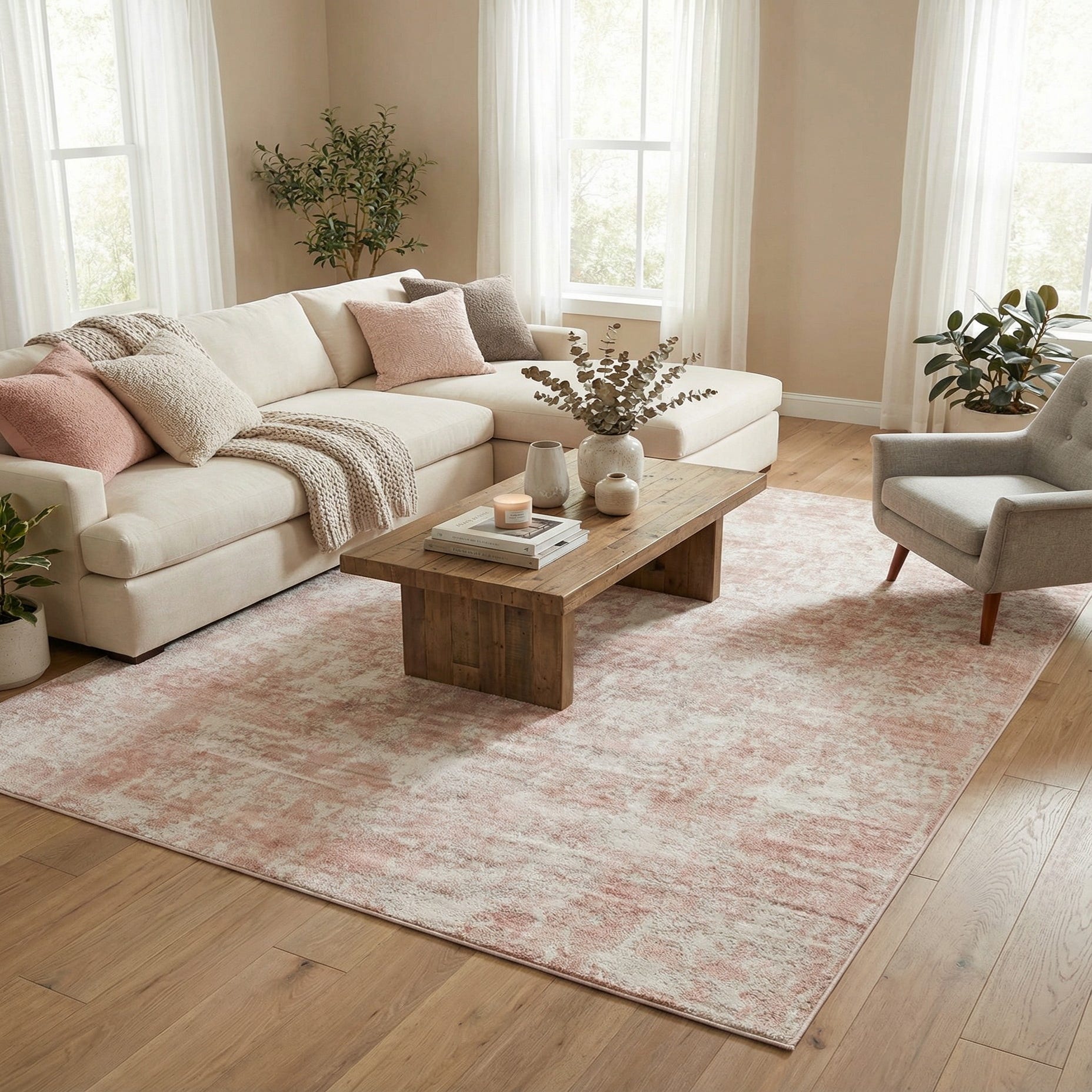 With its neutral yet warm color palette, this rug is versatile enough to be placed in a variety of interior design scenarios. It would complement a modern-minimalist decor by introducing a soft color and texture, or enhance a romantic or shabby chic setting with its faded, ornamental patterns. The rug could serve as a statement piece within a neutral color scheme or blend harmoniously with other warm-toned decors. Its stain-resistant and shed-free qualities further ensure that the rug retains its appearance over time, making it a practical choice for high-traffic areas or living spaces.