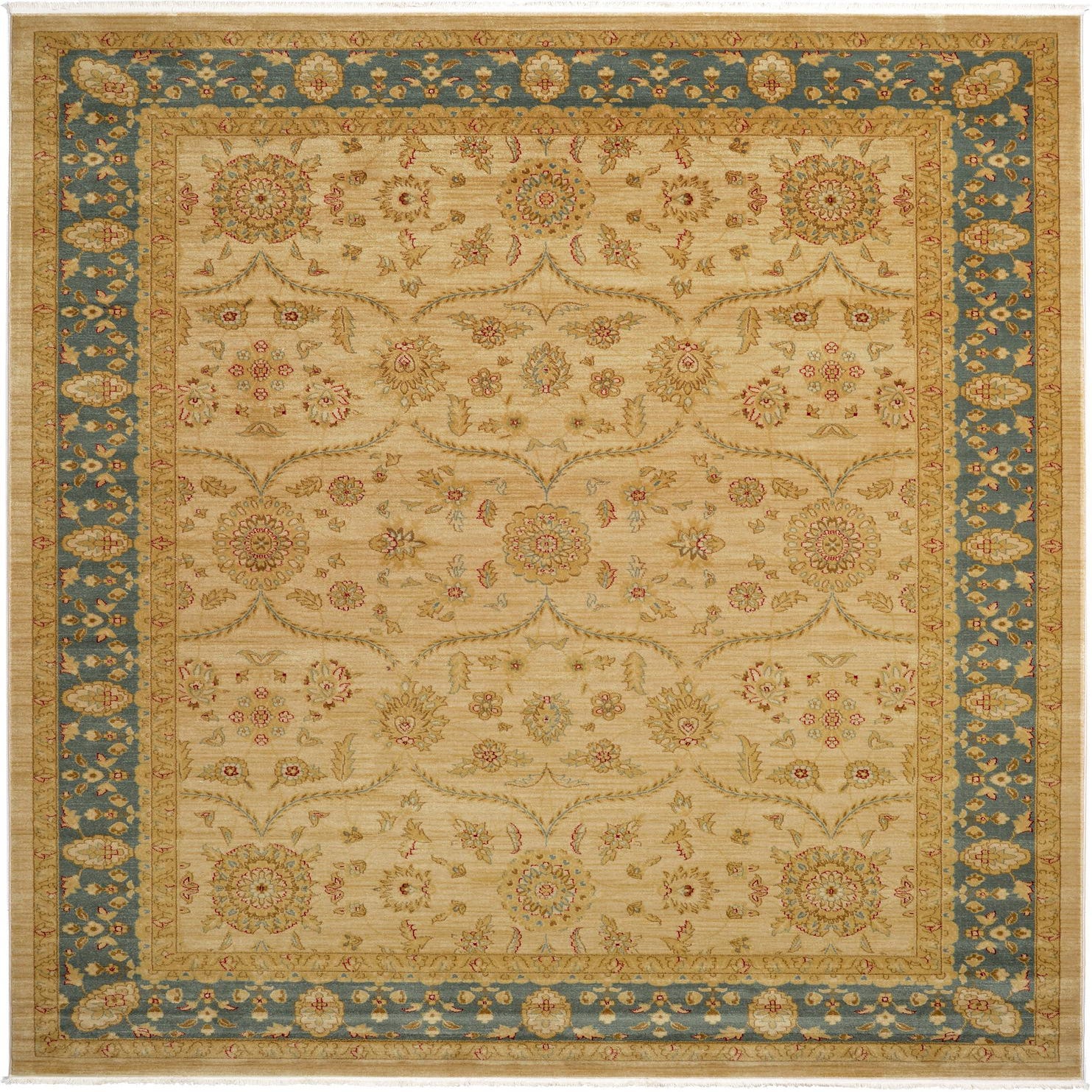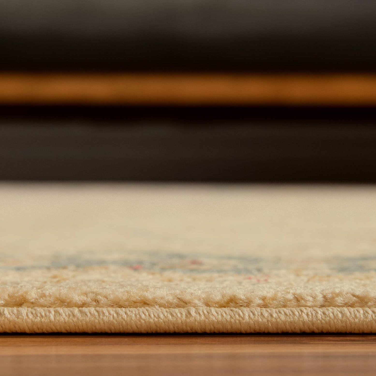 Primary color is Champagne. Colors in this rug include: Champagne, Beige, Blue, Brown, Cream, Red.