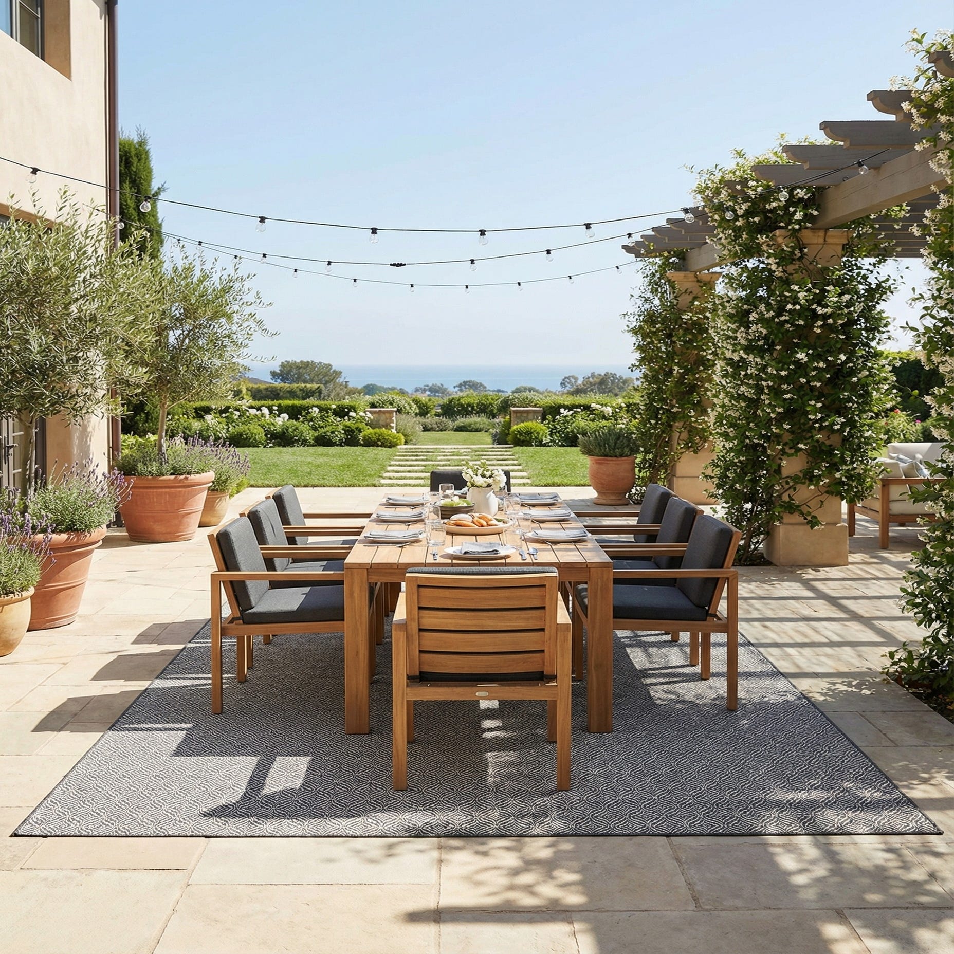 Well suited to covered patios, sunrooms and other indoor-outdoor living areas, this rug also performs reliably in high-traffic interior spots such as entryways, kitchens and family rooms. The neutral charcoal background with gray and ivory accents pairs easily with natural wicker, matte black metal, painted wood or warm hardwood floors, making it a versatile anchor for modern, transitional or coastal-inspired settings.