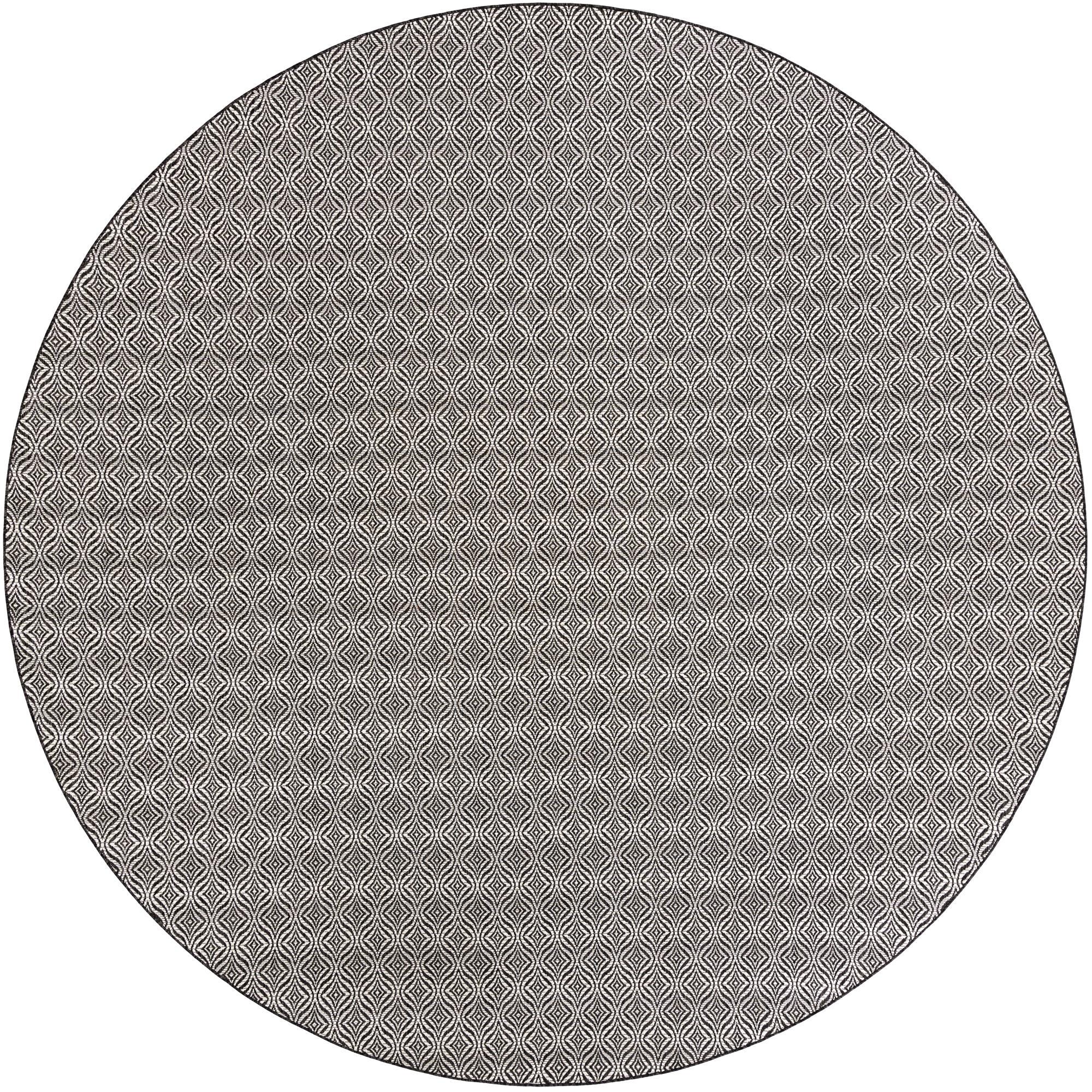 A 13' round black and gray modern trellis pattern rug, suitable for indoor or outdoor spaces like a patio.